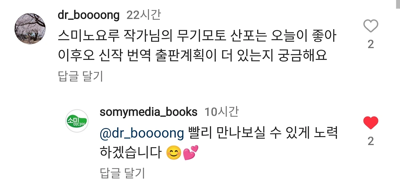 하지만, 이후 나오는 스미노 요루의 책은 계속 재미있었지만 [너의 췌장을 먹고 싶어] 같은 전율을 느끼진 못했다. 그럼에도 불구하고 출간하자마자 예약판매까지 걸어 놓고 스미노 요루의 책을 사 모은다. 언젠가 다시 한번 내 인생 최애도서를 만났을 때의 그 전율을 작가가 다시 전해줄거라 믿으므로.