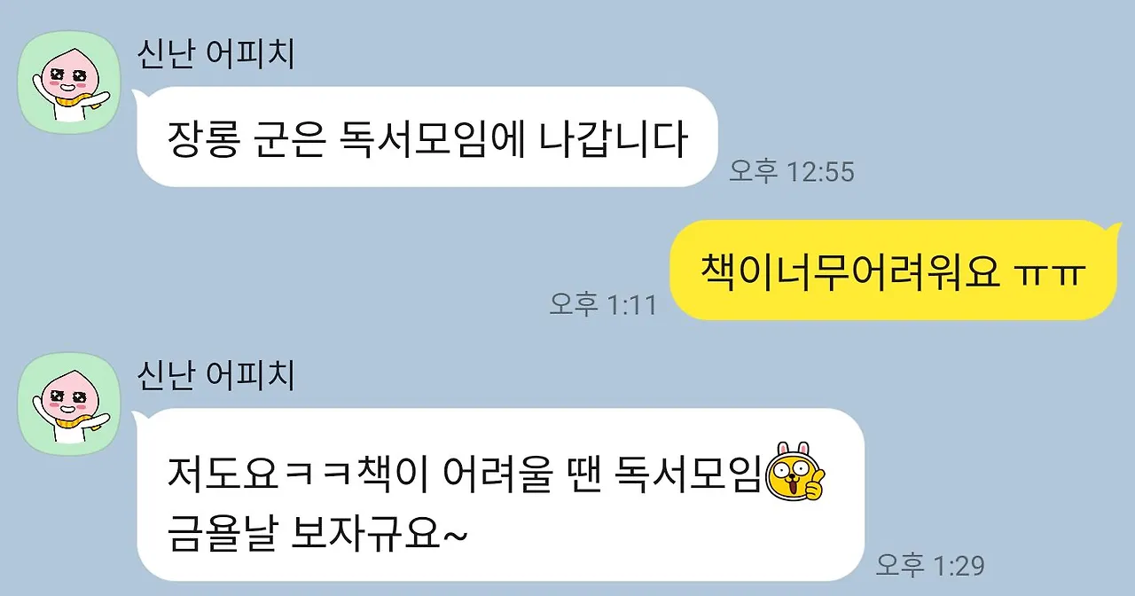 이 모임은 독서모임과 글쓰기 모임을 번갈아 하는 모임인데, 글쓰기 모임에 흥미가 있어서 가입했다가, 오히려 독서모임이 먼저 있다는 이야기를 듣고, 참여하게 된 것이다. 단톡방에서 내 글을 읽으신 모임원 한분께서 해주신 카톡메시지 한 줄이 이번 모임에 참여하는 계기가 되었다.
