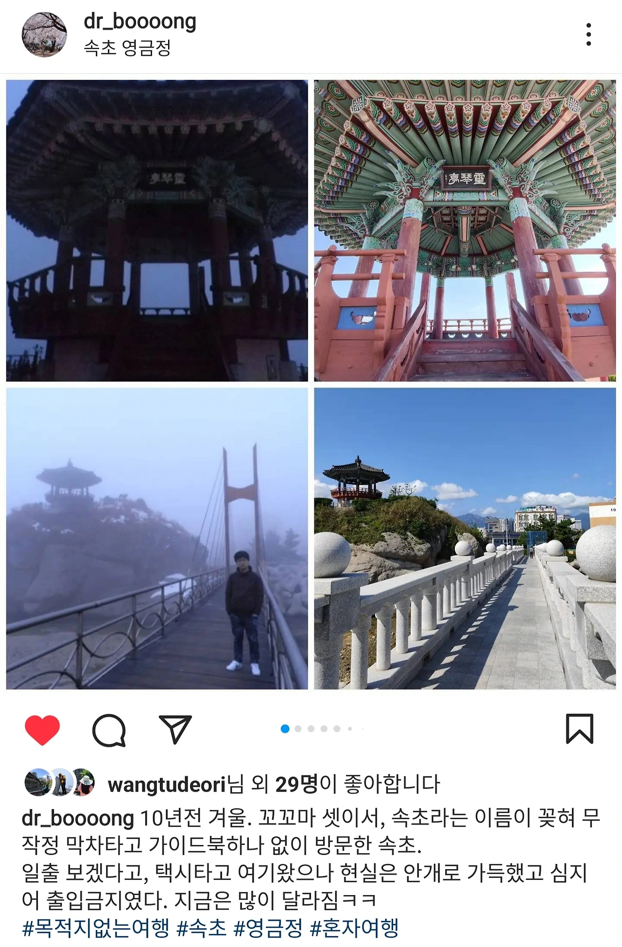 10년 후, 2021년. 혼자서 강원도 여행을 떠났다가 생각없이 속초에 들렀다. 거의 10년만에 밟아보는 속초 땅이었다. 차에서 내리자마자 바다내음이 물씬 풍겨왔다. 땅과의 접촉과 함께 10년 전 빠빠와 농혀빙과 했던 속초여행이 떠올랐다. 블로그를 통해 기록해 놓은 여행기를 읽어보며, 혼자 미소짓고 있는 내가 있었다. 기억과는 달라진 영금정의 풍경을 보고, 같은 위치에서 사진을 촬영했다. 그렇게 10년이 지나 내 기억속의 즉흥여행 에피소드는 후기가 생겼다.