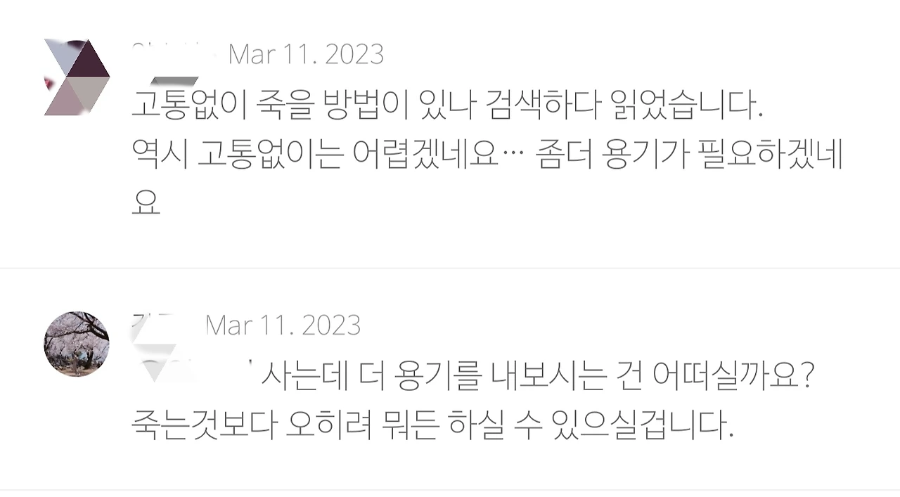 내가 예전에 읽었던 "너의 췌장을 먹고 싶어"라는 소설에서 주인공인 야마우치 사쿠라는, 자살을 하기 위해 매장에 들러, 자살용 밧줄이 있냐는 질문을 가게주인에게 한 부분이 있다. 이건 병을 앓고 있는 그녀가, '죽기 싫으니 누가 나를 좀 말려줘 혹은 누가 나를 구해줘' 라는 의미로 나는 소설을 해석했었다. 아마, [고통없이 죽는법] 이라는 브런치 글을 읽는 사람들 또한 비슷한 사람들이 아닐까? '난 너무 힘든데, 아무도 나를 이해해주지 않아. 누군가 내 하소연을 들어주었으면 좋겠어. 내가 살 수 있게 힘을 줘' 같은 생각 말이다.