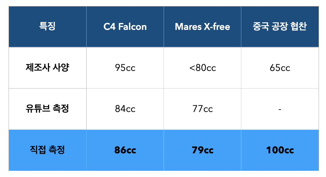 기존에는 C4 Falcon 마스크를 주로 사용하고 있었습니다. 보조 마스크를 추가로 살려고 알아보던 중에, 마스크의 용적을 실험하는 유튜브를 우연히 발견하였습니다. 해당 채널에서 C4 Falcon 보다 용적이 더 작은 Mares X-Free를 알게 되어서 테스트 삼아 바로 구매를 하였습니다. 그리고 오래전에 중국 공장으로부터 협찬받은 저용량 마스크와 함께 C4 Falcon과 Mares X-Free 마스크를 유튜브 방식처럼 직접 테스트를 해보았습니다.