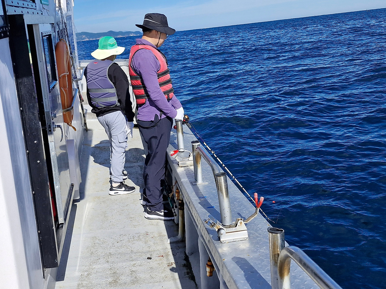 선장님이 배를 세우고 낚시하는 법을 자세히 설명해 주시고 미끼도