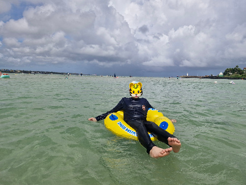 아들은 넓은 바다에 들어오니 너무 신났다.
