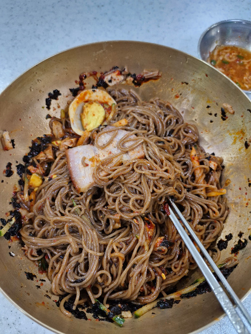 아들이 막국수에 수육을 올려 먹어야 한다며 꼭 시키라고 해서 시켰다.