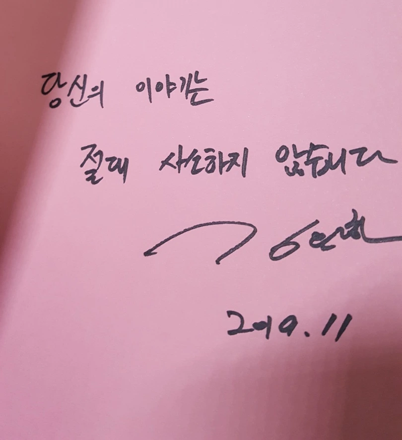 중고책 속지에 저자 싸인이 있었다며 영이 토론 때 올려준 사진이다.