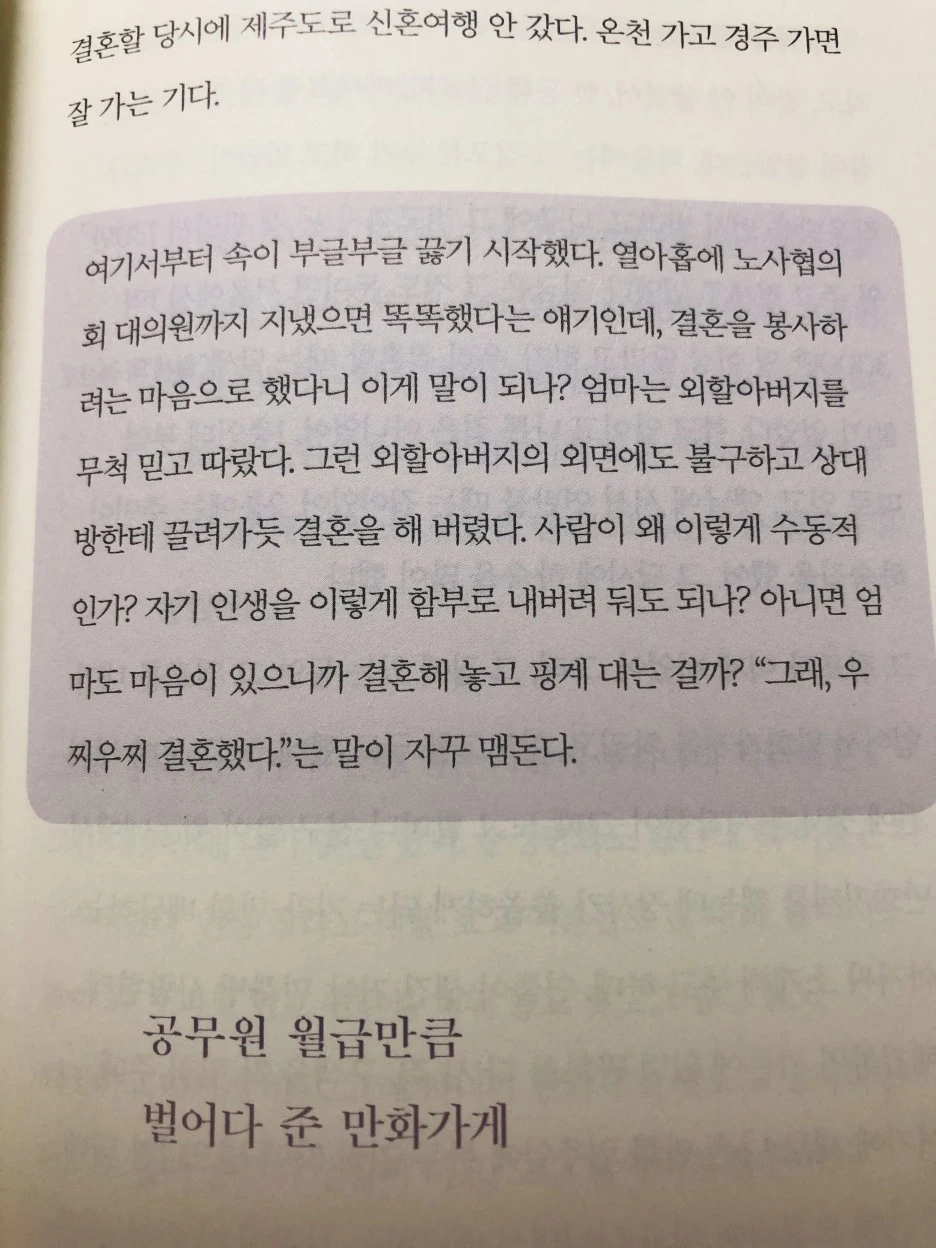 연: 맞아 맞아 진짜 작가 어머니 너무나 재능많으신 분인데 시대가 가로막고 성별이 막음. 난 박영선어머님의 인생자체가 죽을 각오였어서 이혼이라고 달랐겠나... 란 생각이 들더라구.