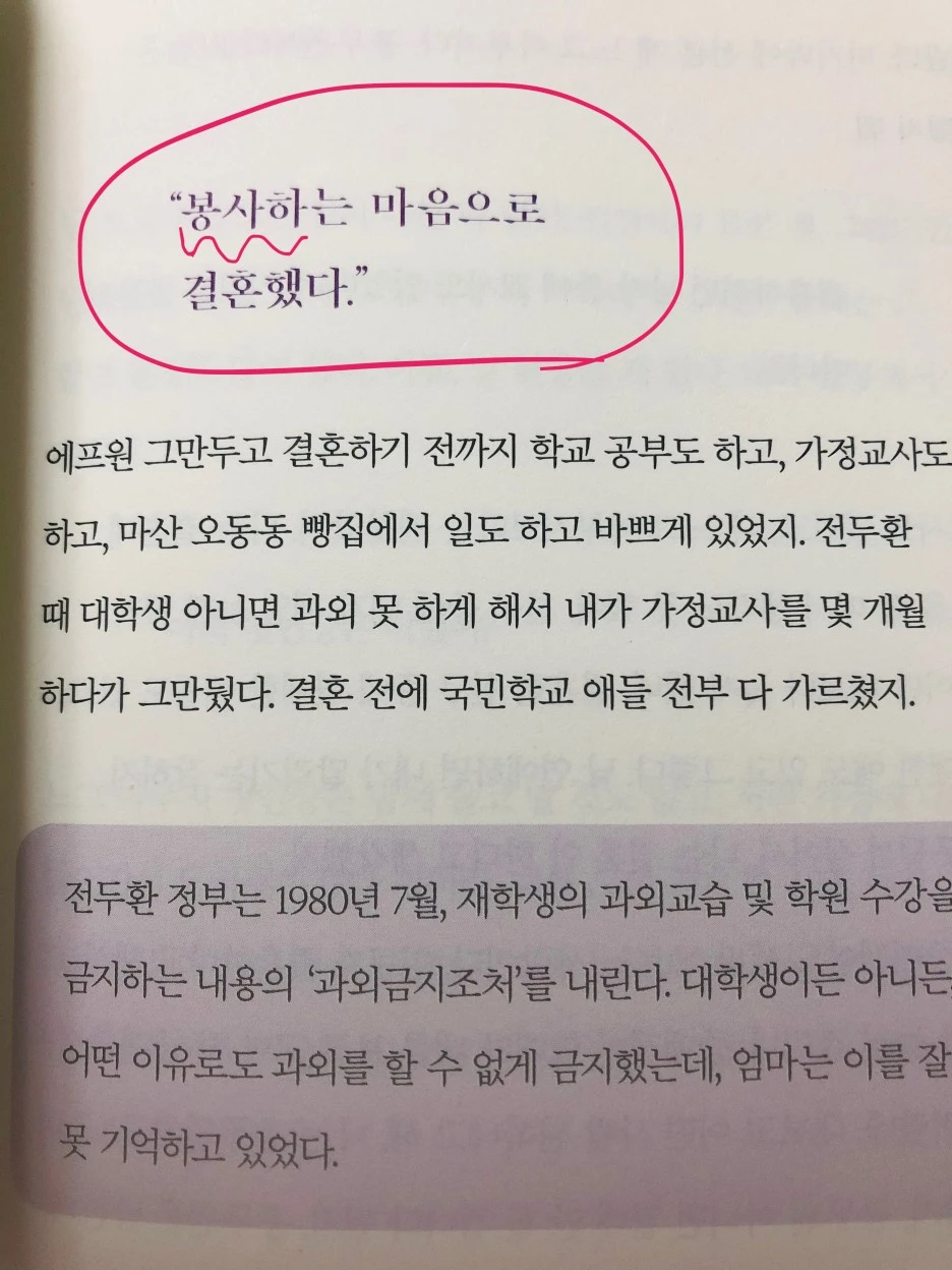 책 읽으면서 특히 정규직에서 비정규직의 삶이 되면서 슬프고 자신을 놓아버린 듯한 선택들이 진행되서 슬펐고 안타까웠어. 그렇게 산 그 부분의 내용은 시간에 비해 구술량도 적었지. 244p. 는 그때의 심정이 뭐였는지 얘기해서 인상깊었어. 맞아... 엄마의 그늘 아래서 가장 벗어나고 싶어하는 게 장녀인데, 또 엄마에게 가장 감정이입하는 게 장녀ㅠㅠ