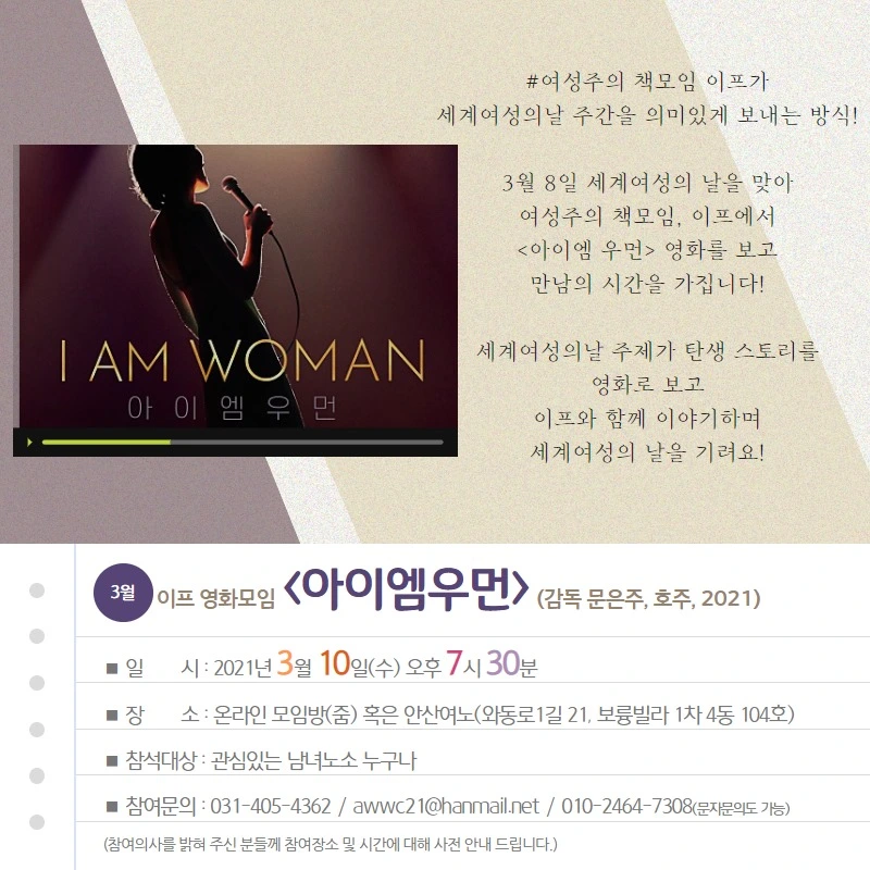 올 1월에 개봉한 <아이엠 우먼>을 먼저 보시길 강추합니다. 세계적인 디바 헬렌 레디 실화 영화인데요. 한국계 호주 사람인 문은주 감독도 만날 기회죠. <보헤미안 랩소디>가 한국에서 크게 흥행했잖아요? 그런데 <아이엠 우먼>을 본 사람들이 그리 많지 않더군요. 헬렌 레디의 삶과 음악을 어찌 퀸에 비하리요! 더구나 그의 노래 <아이엠 우먼>이 바로 1972년부터 세계 여성의 날 공식 주제가가 아니겠습니까. 세계 여성의 날을 기념하며 이 노래와 더불어 더 즐기고 싶다면? 이번이 바로 놓칠 수 없는 기회입니다!