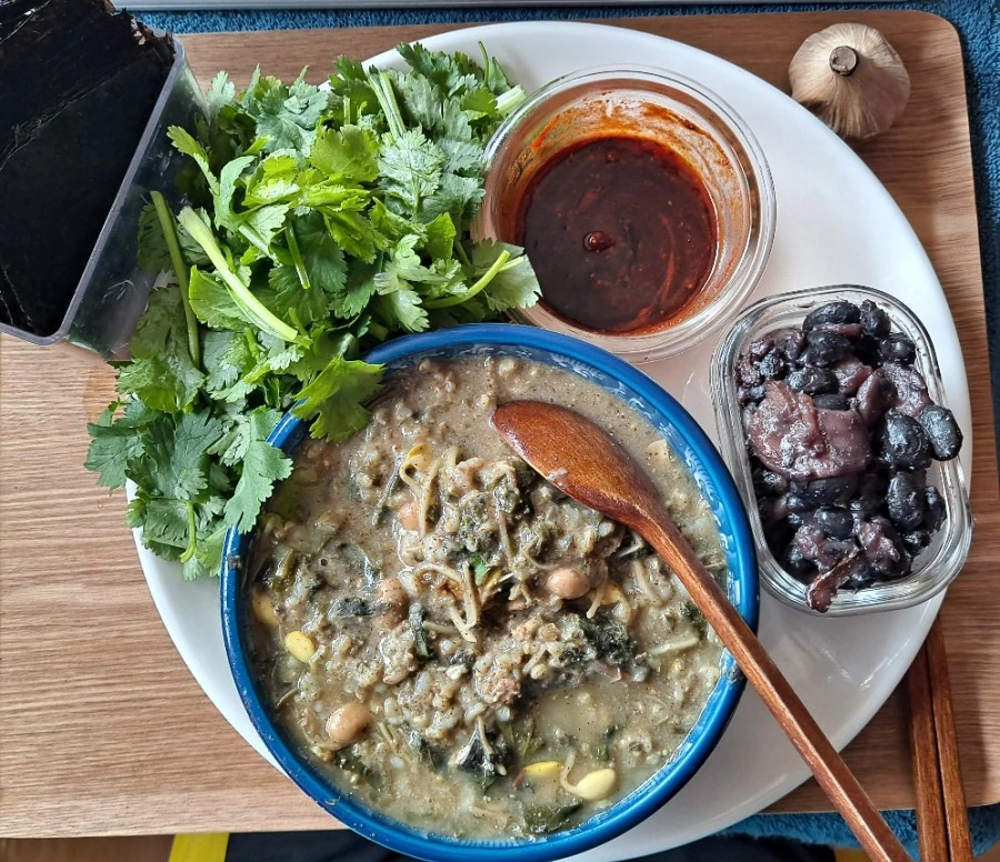 집에서 나 홀로 점심 먹을 땐 한 접시로 담아 먹고 있다. 가짓수도 양도 적정선을 지켜보려는 눈물겨운 노력이다. 고수가 빠지면 섭하다. 접시가 복잡할 정고로 푸른 고수가 접시 한쪽을 채우곤 한다. 채소된장죽 한 그릇에 검정콩조림, 거기다 고수와 생김. 고수를 어떻게 먹을지 그려지는가? 생김 조각에 고수를 싸고 초고추장을 살짝 찍어 먹는다. 고수의 향과 김의 풍미가 어우러져 입안을 가득 채운다. 아, 마늘은 흑마늘이다. 비싸서 자주는 못 먹고 가끔 먹는 '건강 영양식'인 셈이다.