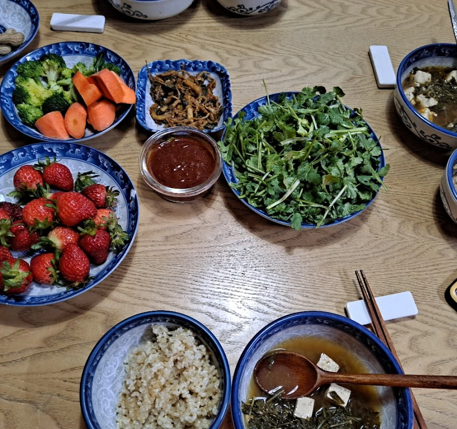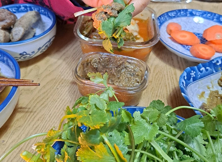 가족이 함께 먹는 저녁 밥상에도 고수가 빠질 수 없다. 채식단으로만 차려지는 밥상에서 고수가 가장 듬뿍 담겨있다. 고수는 자체 맛과 향이 있어서 그냥 먹어도 확실히 맛있다. 아삭거리고 질기지 않아서 씹기에 부담도 없다. 세 식구 먹다 보면 고수 접시가 다시 채워지기도 한다. 진정 고수 밥상? 내 짝꿍의 경우 20여 년 전 중국에 처음 갔을 땐 샹차이를 도저히 못 먹고 돌아온 사람이다. 그러나 너무너무 맛있다 까지는 아니지만 고수를 즐기는 사람이 됐다. 음식은 절대 취향일까? 이 땅에 사는 사람은 모두 토종재료를 좋아할까? 그렇진 않은 거 같다. 먹으면서 익숙해지고, 자주 먹는 게 익숙해지고, 그게 취향이 되기도 하지 싶다.
