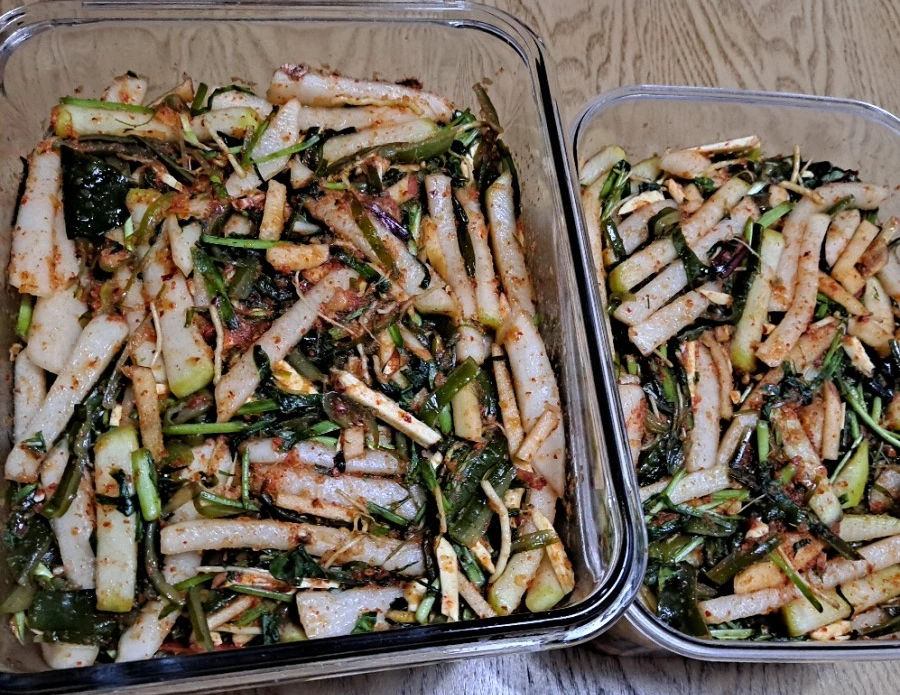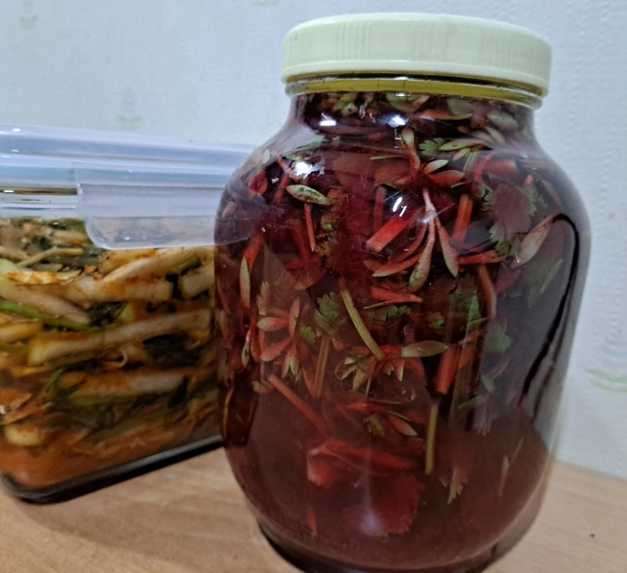 생채식도 좋지만 김치로 담근 발효 고수 맛도 끝내준다. 고수가 들어간 물김치와 무채 김치 두 가지를 만들어 봤다. 물김치 주재료는 비트, 돌나물, 고수 세 가지다. 셋 비율도 거의 같이 넣었다. 마늘 생강 소금이 양념의 전부다. 비트가 단맛을 낼 것이고 고수 향과 어우러지며 발효할 것이다. 무채 김치는 내 맘대로 재료가 제법 섞였다. 주재료는 무, 씀바귀, 미역줄기다. 거기에 사과 한 개, 생밤 다섯 개 채 썰고, 부추 줄기, 고수와 딜을 썰어 넣고 마늘 생강 고춧가루로 버무렸다. 바로 먹어도 아삭거리고 풍미가 좋은 생채가 된다. 그러나 하루 상온에서 맛을 들이고 냉장고에 넣어두고 먹으면 때마다 고수와 딜의 향이 은은하게 풍길 것이다.