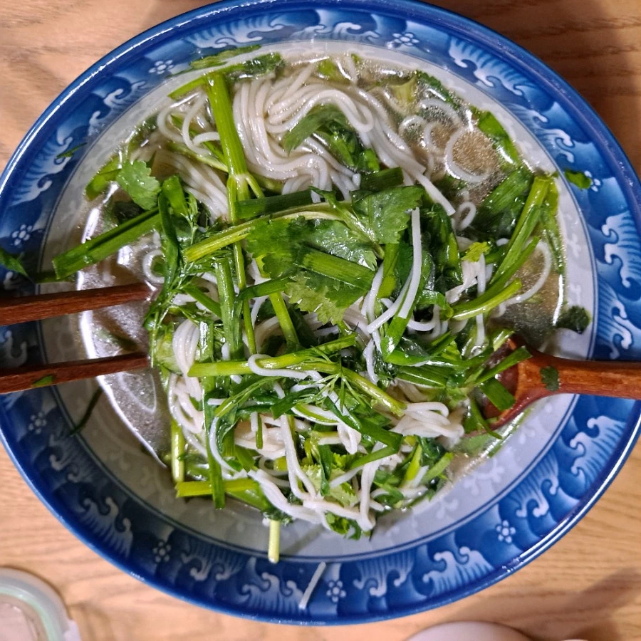 밀가루 음식과 거리를 두는 편이지만 가끔은 우리밀 국수를 먹을 수 있다. 이름하여 '향기 나는 녹색 잔치국수'다. 다시마와 표고 그리고 멸치 쪼금 넣어 다시 국물을 우려낸다. 국물과 국수물이 끓는 동안 채소를 씻어 적당한 길이로 썰어 둔다. 국수를 삶아 찬물에 헹군다. 조리 국자에 국수를 1인분 넣고 뜨거운 국물에 적신다. 그릇에 담고 채소를 위에 얹고 뜨거운 국물을 끼얹어 담는다. 뜨거운 국물로 숨이 살짝 죽은 채소들과 국수를 섞어 먹는다. 베트남 쌀국수만 고수 먹으란 법 있어? 심심하면 참기름 한 방울 떨어뜨리면 된다.