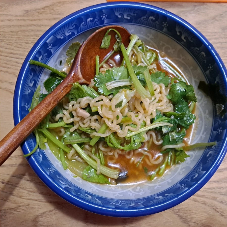 어떤 날은 고수 라면도 좋으리. 딸과 함께 한살림 라면에 고수를 듬뿍 넣어 먹는다. 라면 먹을 일이 자주 없지만 한살림 우리밀 라면을 식구들과 끓여 먹을 때도 있다. 아들들이 끓이면 감자며 파며 달걀 등이 들어가는 거 같다. 딸과 끓여 먹을 땐 고수만으로도 족하다. 나는 대체로 라면은 몇 젓가락 거들어 먹는 정도다. 그러나 고수 한 웅큼 넣은 라면이라면, 한 그릇이라도 먹을 수 있으리. 사진에 보이는 게 내가 먹은 라면의 전부였다. 입큰 사람이라면 한 젓가락 한 입에 후루룩할 라면인데 고수를 섞으니 제법 많아졌다. 이런 메뉴 이름은 고수 라면일까 라면 고수일까? 어쨌거나, 나는 고수가 좋다. 점점 고수가 좋아지는, 자연식 고수의 고수 밥상이었습니다만!