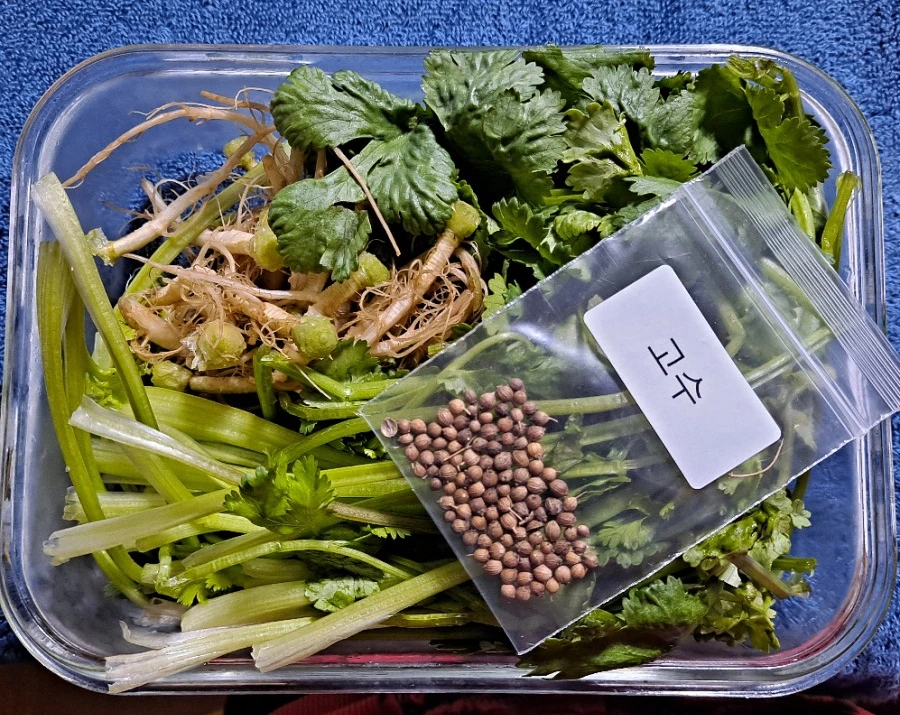 고수는 내가 거의 매일 먹을 정도로 우리 집에 안 떨어지는 채소다. 입 줄기 뿌리 씨앗까지 다 먹을 수 있다. 미나릿과답게 맛과 향이 미나리를 많이 닮았지만 다르다. 사람 따라 호불호가 갈리는 점도 미나리 비슷하다. 조선시대부터 우리 땅에서 재배된 채소라는 걸 알면 놀랄걸? 함경도 고수김치, 파주 고수김치가 있으니 말이다. 절에서 달래 대신 고수장을 양념으로 밥 비벼 먹는 데도 있다. 고수 먹고 싶어 절에 들어갔다는 어떤 사람의 글을 읽은 적이 있다. 매일 고수 먹고 싶은 사람이 나 말고 있어서 무지 반가웠다.