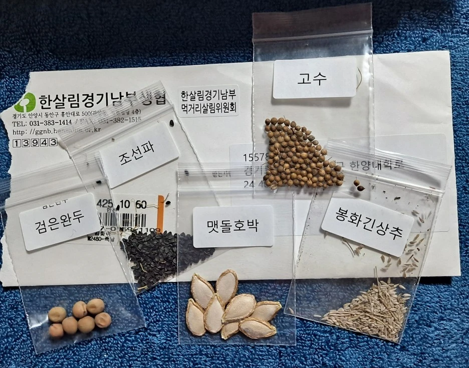 한살림에서 나눔 하는 토종씨앗이 스무 가지 정도 되던가? 그중에 내가 받고 싶은 걸 다섯 가지 이하로 선택할 수 있었다. 낯선 듯 귀엽고 사랑스러운 씨앗 이름에 나는 열광했다. 박이면 박이지 동아박은 어떻게 생겼을까? 상추는 상추인데 봉화긴상추는 어떻게 다르지? 뿔시금치는 잎이 뿔처럼 생겼던가? 검색해도 이미지가 잘 나오지 않았다. 무얼 고르고 무얼 포기해야 할지 정말 어려웠다. 동아박, 강화근대, 조선아욱, 대추밤콩, 뿔시금치, 가시홍화, 키작은 강남콩 ..... 이름이나마 불러 보았다. 나는 봉화긴상추, 맷돌호박, 조선파, 검은완두, 그리고 고수를 골랐다. 고수를.