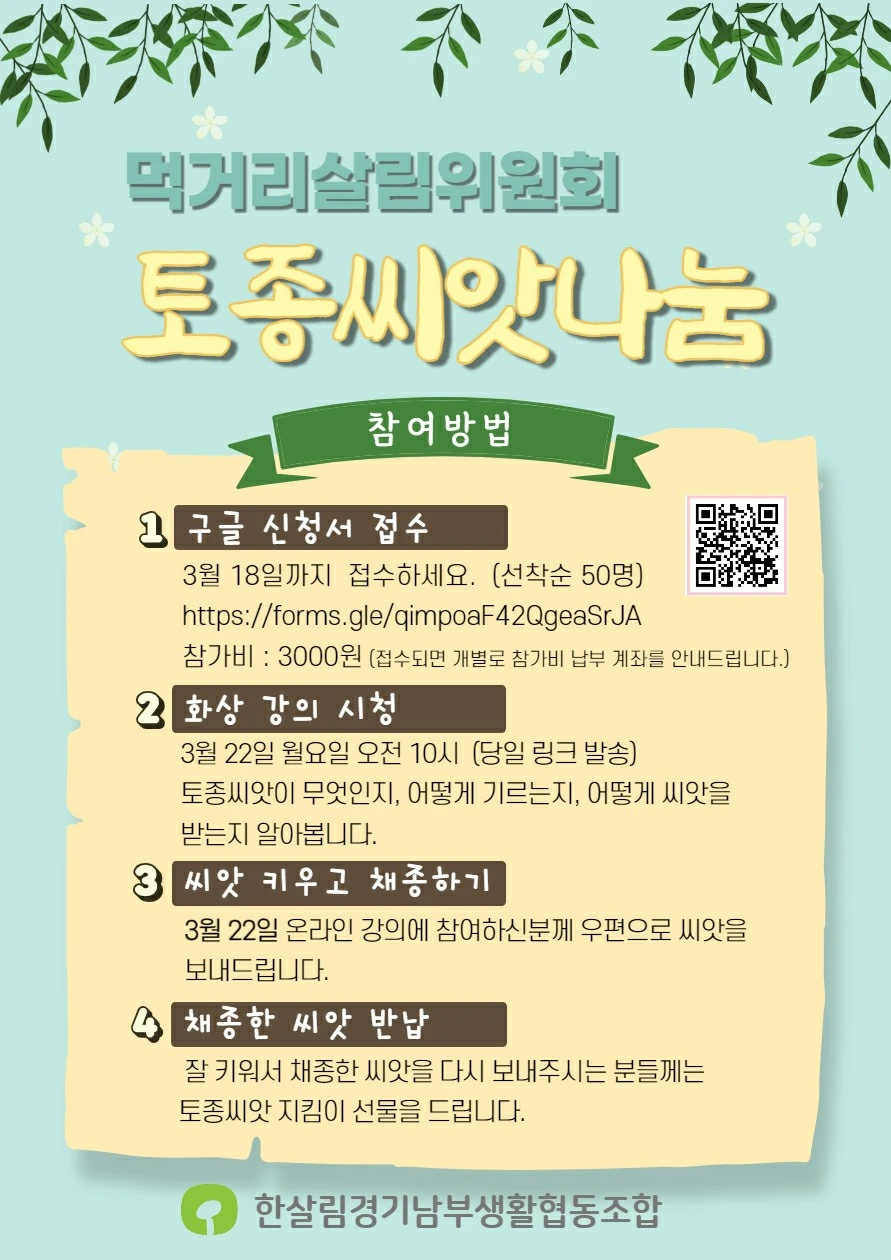 우편으로 토종씨앗을 받았다. 한살림 먹거리 위원회에서 하는 '토종씨앗 나눔' 행사를 통해서였다. 토종이란 어감에 이끌렸을까. 씨앗에 혹했을까. 농부의 딸로 자라서 일게다. 매년 봄이면 '농사 앓이' 비슷한 걸 하는 거 같다. 집 앞에 텃밭 한 뙤기 있으면 참 좋겠다. 도시농부 텃밭이 멀어서 몇 해 하고 포기한 게 미련이 남는다. 올해도 토종 모종 나눔과 토종씨앗 나눔 덕분에 어설픈 '도시농부' 흉내를 내게 됐다.