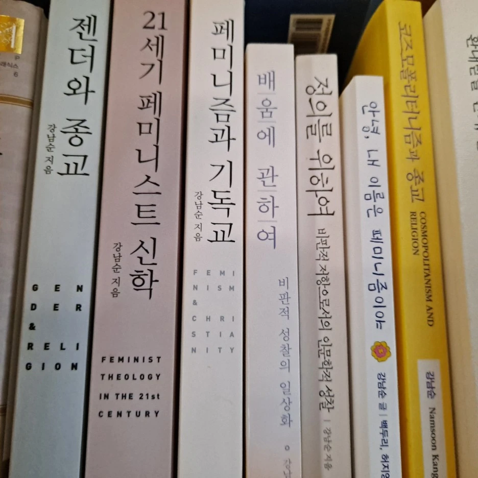강교수님과의 추억 사진을 꺼내보게 됐어요. 2018년 연말 페미니즘 카페 '두잉'에서 강의를 듣고 사인을 받았더랬죠. 코로나 이전엔 마스크 없이 가까이 얼굴을 들이대고 웃을 수도 있었군요. 제 책장 한쪽을 차지하고 있는 강교수님의 책들에게도 새삼 눈길이 갔어요. 아이들도 읽을 수 있는 책 <안녕 , 내 이름은 페미니즘이야>가 나왔을 때가 생각나요. 반가워서 교회 식구들에게 선물로 돌리지 않을 수 없었죠. '백합과 장미'도 이 책 토론으로 시작했고요.