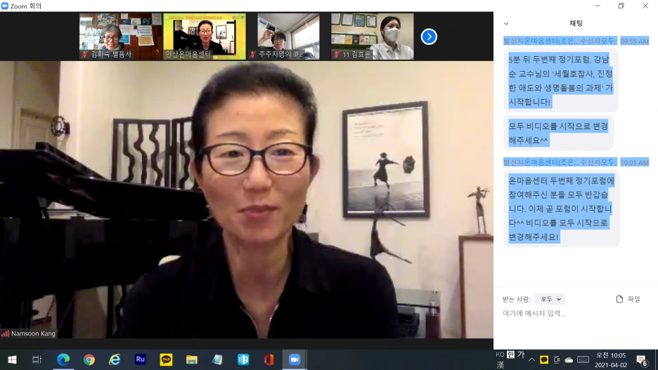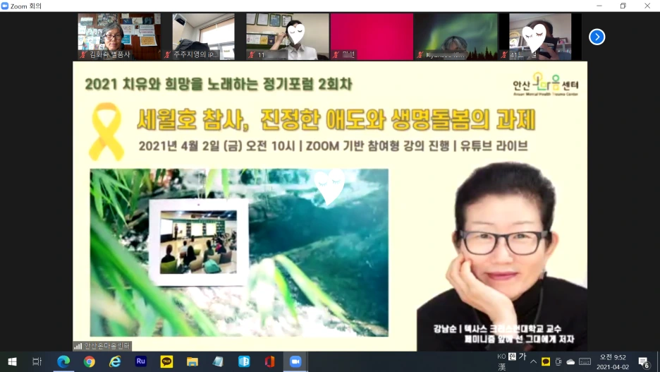 저는 강의 시작 때 교수님과 인사하고는 작정하고 열심히 타이핑했어요. 줌 화면으로 몇 번 눈을 마주치지 못했을 정도로 몰입해서요. 평소 제가 강교수님 책과 강의를 널리 나누고 싶을 만큼 좋아했다는 거죠. 참,안산온마음센터가 뭐 하는 곳이냐고요? 좋은 질문이에요. '416세월호 참사 피해자를 포함한 트라우마로 고통받는 이들에 대한 전문적· 지속적· 집중적 서비스를 제공하는 기관'이랍니다. 안산에 자리 잡은 국내 최대의 트라우마 치유기관이라고 소개할 수 있겠어요.