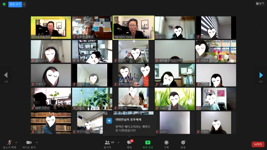 이번 강의는 세월호 참사 7주기를 맞는 특강이었어요. '2021 치유와 희망을 노래하는 안산온마음센터 4월 정기포럼'. 안산과 전국에서 세월호 7주기를 생각하는 사람들이 연대하는 기회이기도 했어요. 가만히 있을 수는 없으니까요. 일곱 번째 봄을 만드는 또 하나의 방법으로 강의 듣기를 택한 사람들이었어요. 끝날 때쯤 확인해 보니 줌 참가자 숫자가 141을 가리키고 있었어요. 안산과 전국, 해외에서도 접속한 분들도 있었어요.
