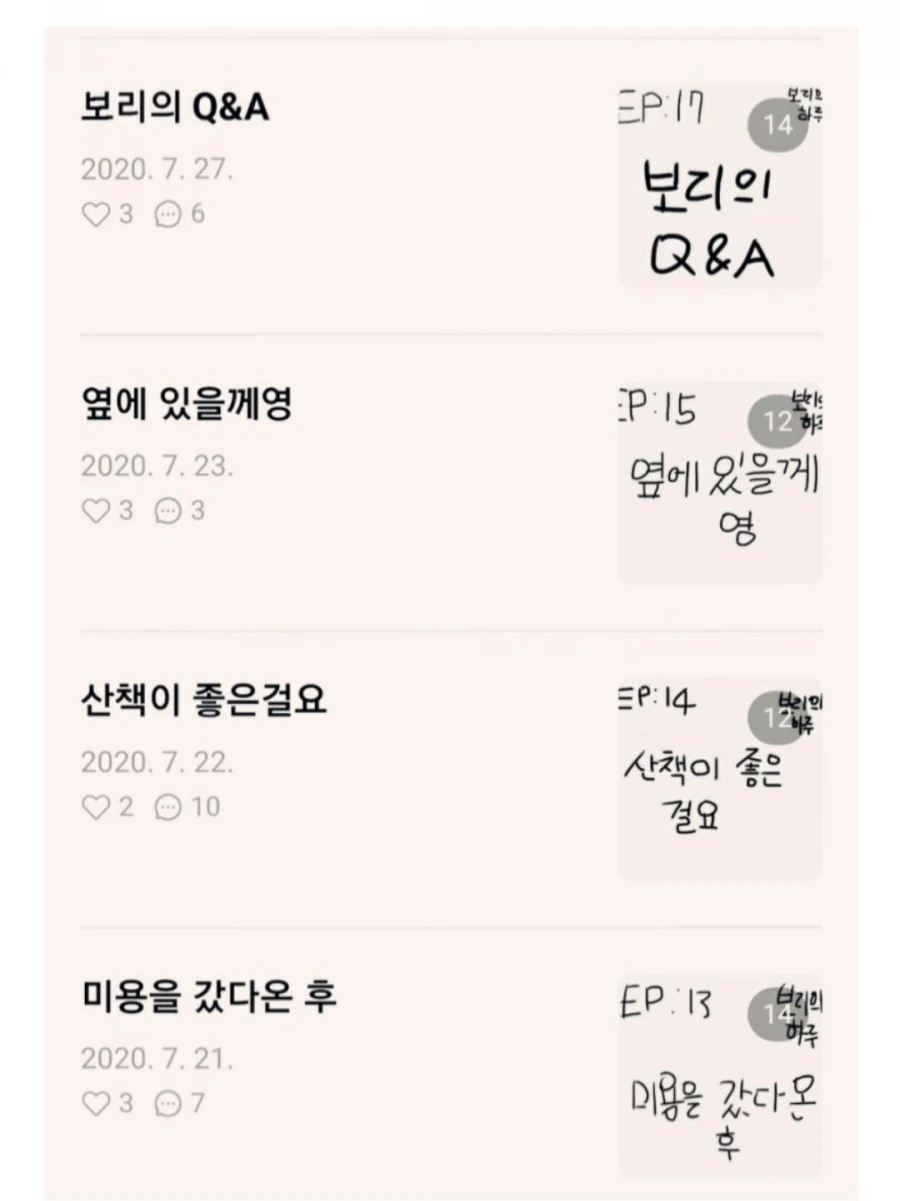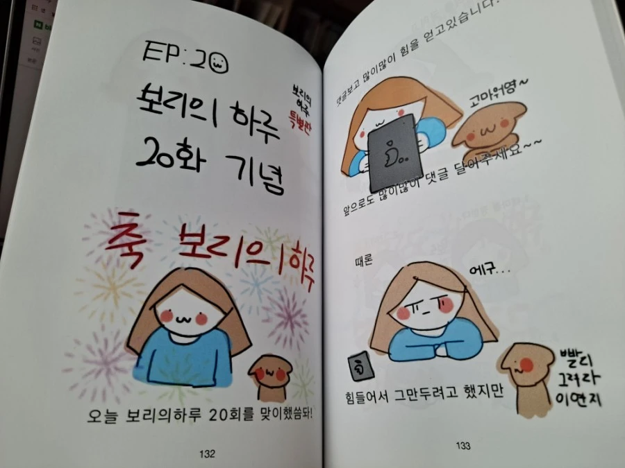 <보리의 하루> 20화 기념 특별판도 있다. 중간에 그만두려고 한 적도 있었단다. 왜 아니겠어. 꾸준히 글쓰기하는 사람들은 안다. 계속 쓴다는 게 얼마나 큰 노동인지를. 20화까지 계속 달려온 기념으로 작가는 창작의 고통을 고백한다. 그림 그리는 과정을 네 단계로 소개도 한다. 1. 테마를 정한다. 2. 그린다. 3. 그림을 엄마 폰으로 보낸다. 4. 블로그에다 올린다. 완성. 독자를 위한 특별 보너스로 다양한 보리 스타일에 보리 배경화면도 방출한다.