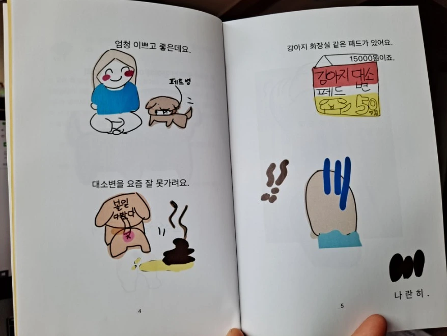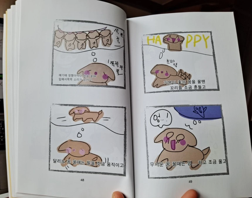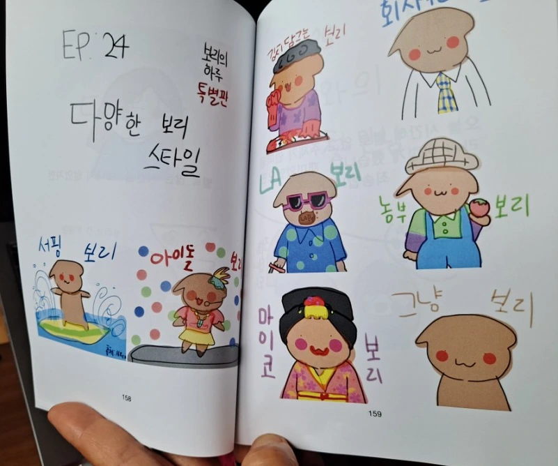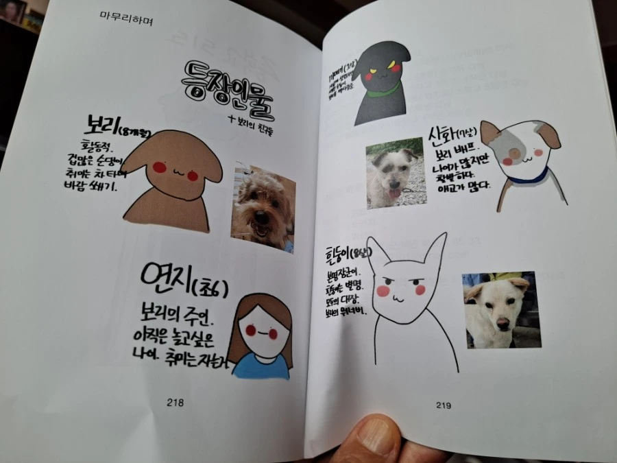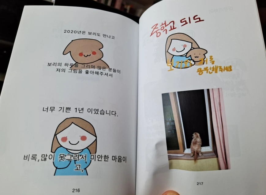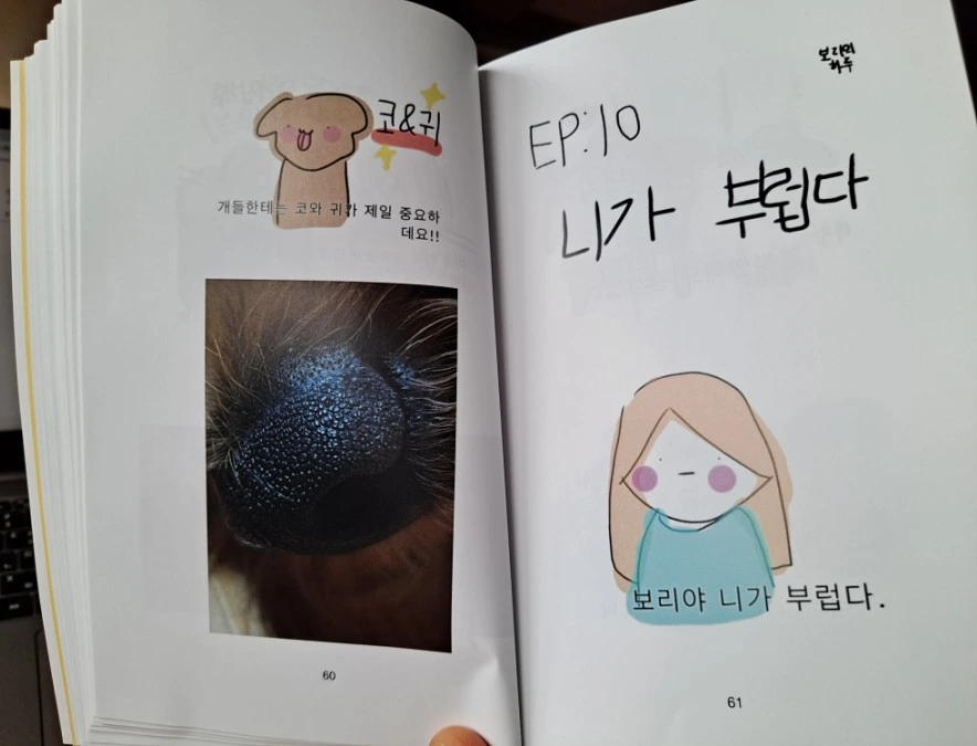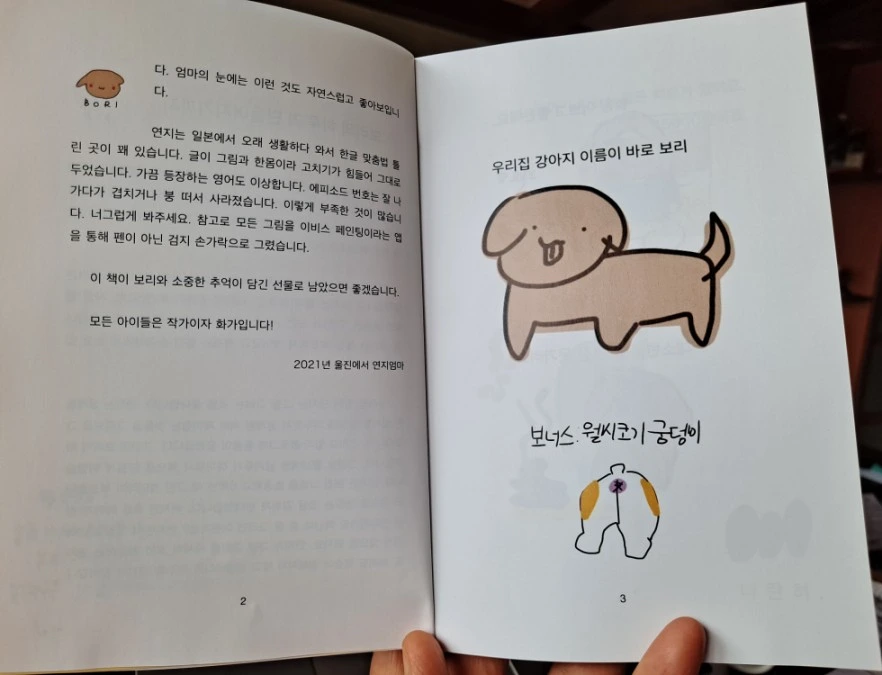 작가는 유치원과 초등학교 시절 대부분을 일본에서 보냈다. 한국에 태어나 한글을 겨우 알 무렵 일본으로 갔다가 다시 왔으니 언어생활이 만만하지 않았을 것이다. 한국 초등학교 5학년이면 학습량이 많아지는 시기다. 새로운 적응이 쉽기만 했을 리 없다. 작가의 한국 생활 적응에 함께 한 좋은 친구가 바로 반려견 '보리'였다. 엄마를 졸라 '동생'으로 입양한 강아지였다. 그림을 좋아하는 작가는 보리를 그려 틈틈이 엄마의 블로그에 올렸다.