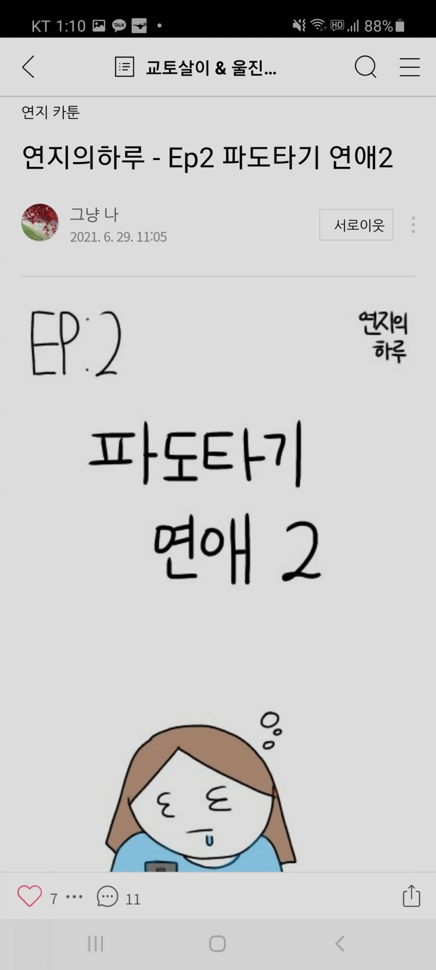 어느새 <연지의 하루>로 후속작을 그리고 있는 작가에게 박수를 보낸다. '파도타기 연애' 에피소드 정말 정말 재미있다. 댓글 달지 않을 수 없을 정도로 놀라웠다! 자기표현력, 상황 판단력, 삶에 대한 통찰력, 그리고 솔직직담백함이 빛나는 이야기였다. 그렇다. 창조력의 가장 큰 적은 자기 불신이다. 뭐든, 모든 걸, 글로, 그림으로 그렇게 옮겨 버리길 뜨겁게 응원한다.