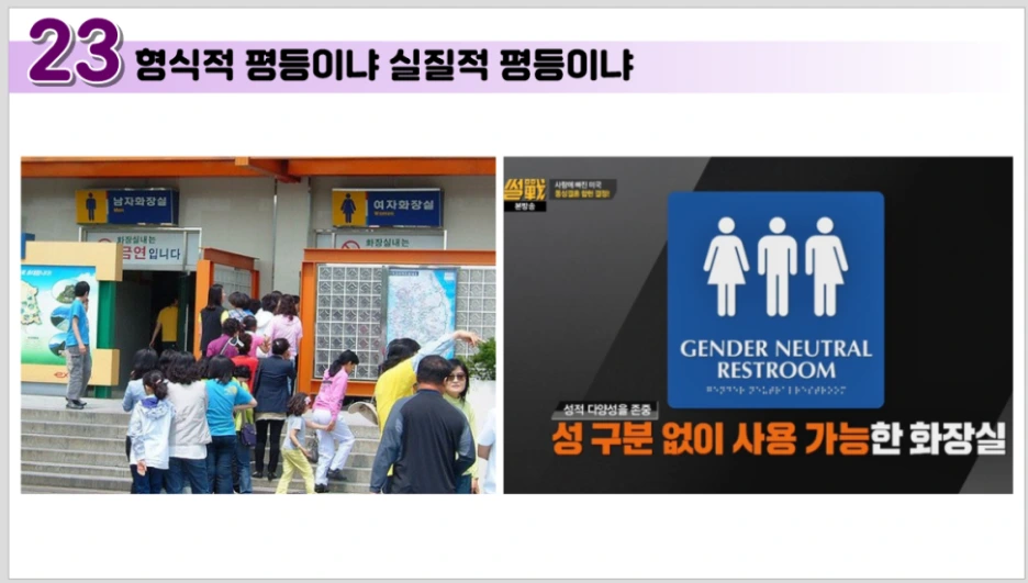 실질적 평등은 남자화장실 여자화장실 두 공간 확보에 적정한 변기수 있다고 된건 아니다. 어느 쪽 화장실에서도 안전을 느낄 수 없는 사람이 있기 때문이다. 예로 트랜스젠더는 남자화장실에서는 여자가 들어왔다는 오해를 사고 여자화장실에서는 비명을 들어야 하기 때문이다. 결국 실질적 평등을 이루자면 배제되고 차별받는 이가 없어야 하는 것. 성중립화장실이 필요한 이유다. 이런 고려는 결코 특별한 '배려'가 아니라 평등권이다.