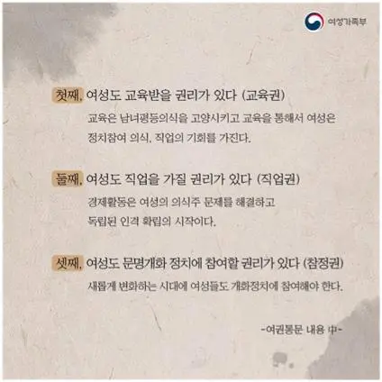 혹 이목구비와 사지 오관의 육체에 남녀가 다름이 있는가. 어찌하여 병신처럼 사나이가 벌어 주는 것만 앉아서 먹고 평생을 깊은 집에 있으면서 남의 제어만 받으리오. -여권통문
