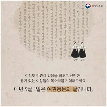 "우리나라 최초의 여성인권선언문이 발표된 날을 기념하기 위하여 매년 9월 1일을 여권통문(女權通文)의 날로 한다." -양성평등기본법 38조 2항