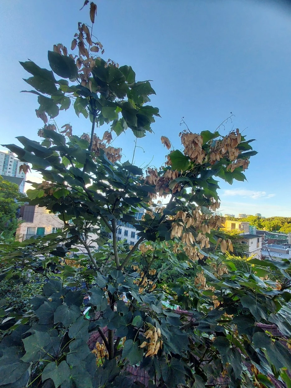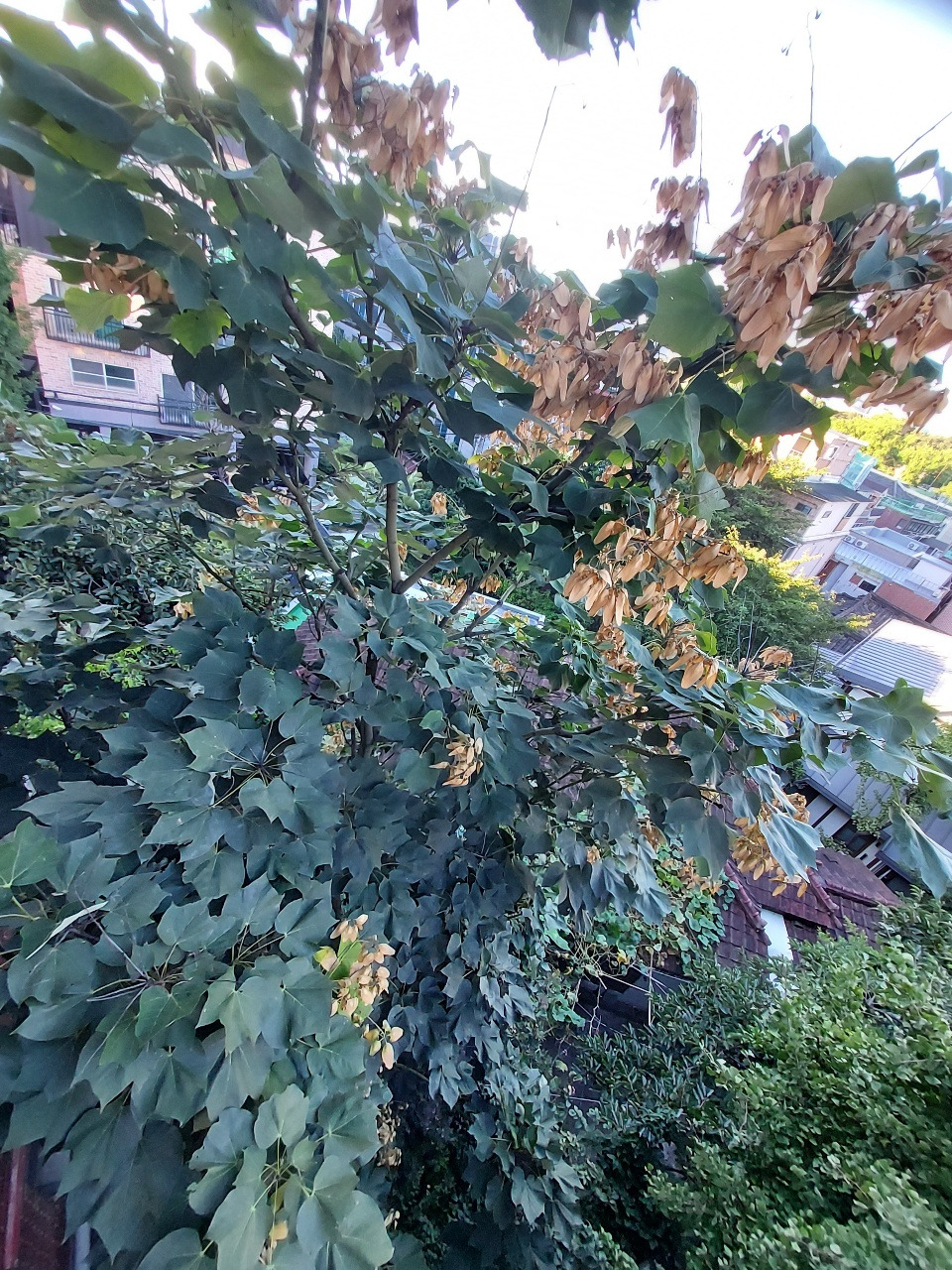 한 주 한 번 주말에 오는 서울 집이자 교회 뒤란에 벽오동이 한 그루 있어요. 부엌 창으로 내다보면 계절마다 변하는 벽오동을 볼 수 있어요. 3층 베란다에선 벽오동이 더 가까이 있죠. 나무 껍질이 벽색(푸른색)이라 벽오동이라죠. 잎은 여전히 푸른데 한 주만에 씨방은 더 가을색으로 짙어 졌네요. 이런 신기한 나무라니, 처음 본 날의 감동을 어찌 표현할 수 있을까요. 오동나무 잎 모양은 또 얼마나 다양한지요.