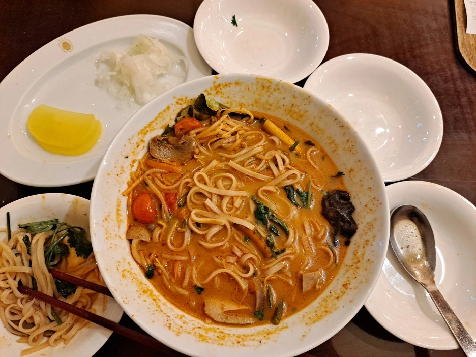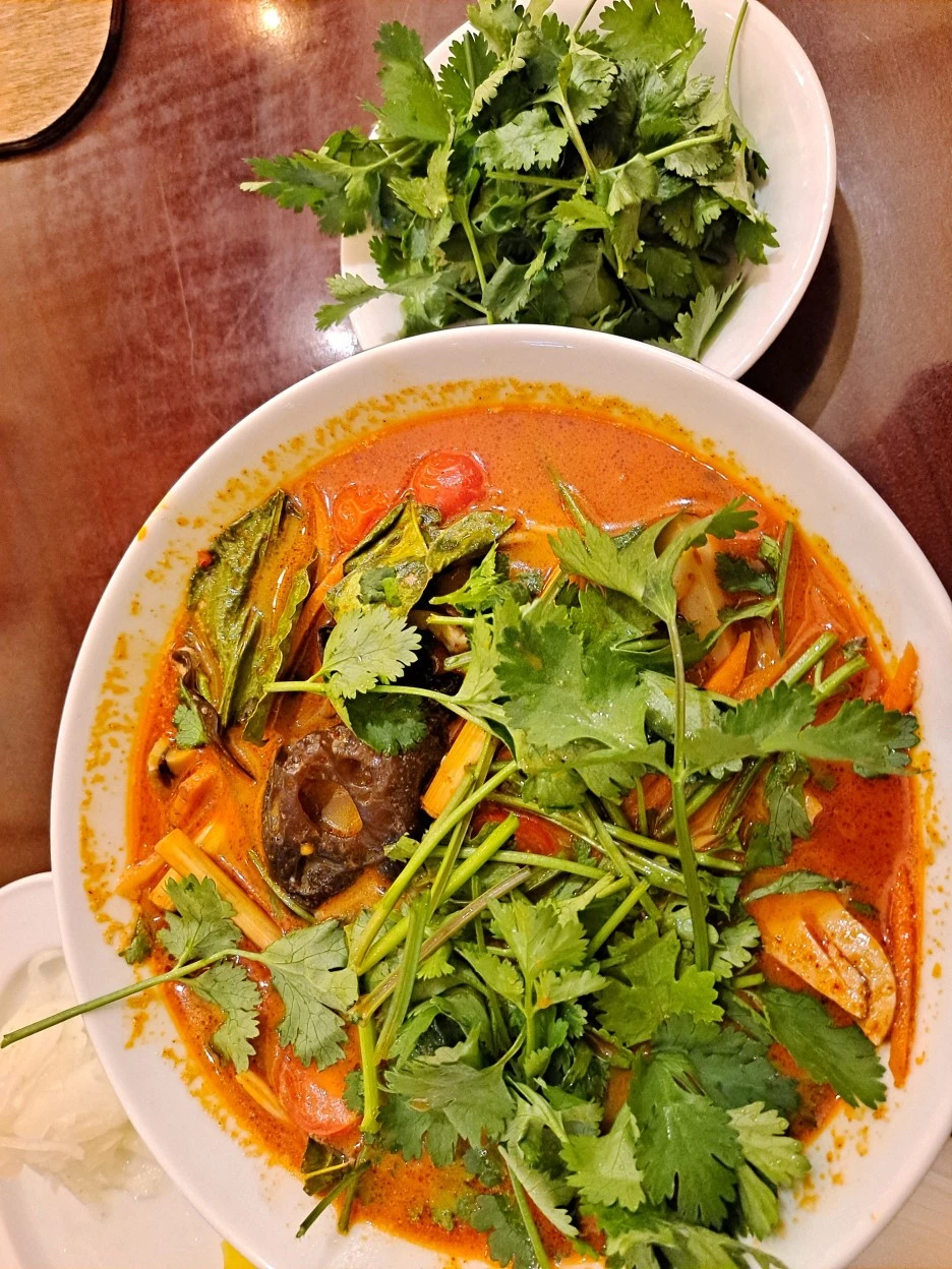 똠얌이 뭣이 그래 좋으냐고요? 맛있고 향기로우니까요. 동남아 향신료랑 향기 나는 채소가 다 좋아요. 이 집 똠얌은 기성품 액상 국물이 아니라 레몬그라스 갈랑갈 월계수잎 등등 자연재료로 끓인 국물이죠. 고기도 넣고 끓인 건 알지만 100% 채식 고집하지 않고 비건 똠얌이라 여기고 즐겨요. 국물은 물론 남기죠. 한 번씩 가다 이렇게 향신료 가득 고수 가득 먹어줘야죠.