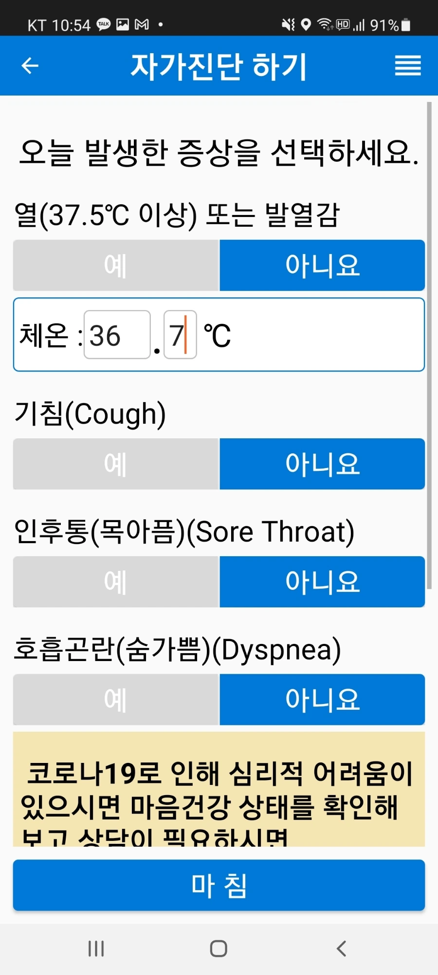 스마트폰 앱 설치, 아주 간단한 것 같으나 잘 안됐다. 마지막으로 담당 공무원의 아이디를 입력해야 작동하도록 돼 있는데 거기까지 잘 안됐다. 결국 '사람 불러야' 했고 서울서 자가격리 중인 딸과 줌으로 연결했다. 노인 환자들은 과연 이런 앱을 바로 설치할 수 있을까? 나처럼 바로 도움을 청할 자식 없는 환자는 어떻게 할까? 그런 생각을 하지 않을 수 없었다. 어제도 오늘도 체온을 측정해 입력하고, 기침, 인후통, 호흡곤란에는 '아니오'를 클릭했다.