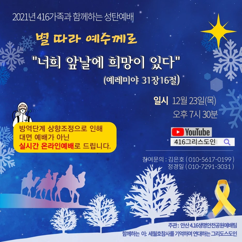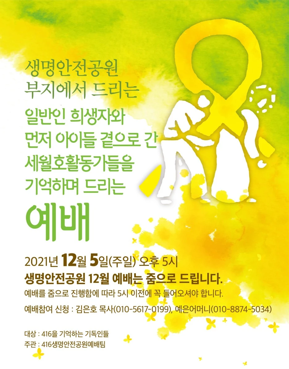 네 친구들과의 약속처럼 나도 12월엔 약속을 새롭게 했단다. 별이 된 너희를 기억하겠다는 약속 말이야. 진상 규명도 이룬 것 없이 너희의 7주기를 보낼 땐 정말 힘들었단다. 그리고 어느새 해가 또 바뀐다니 더욱 그랬어. 그래도 우리는 한 달 한 번 하는 예배와 성탄 예배를 함께 했어. 간절한 마음들이 온라인으로 연결되었지. 그리고 세종문화회관 S 시어터에서 416합창단 기획공연도 있었단다. 잊지 않을게, 목이 메며 약속의 노래를 불렀단다.