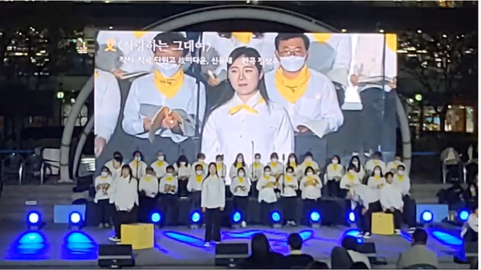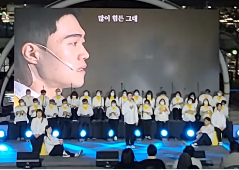 친구들을 깜짝 놀라게 했을 그 노래 <사랑하는 그대여>가 올해 안산에서 합창으로 울려 퍼진 거 알지? 지난 4월 15일(금) 저녁 안산 문화광장에서 세월호 참사 8주기 기억문화제에서였어. 전체 행사 3시간 중 2시간 20분쯤에 안산의 밤하늘에 "사랑하는 그대 오늘 하루도 참 고생했어요~~" 울려 퍼졌단다.