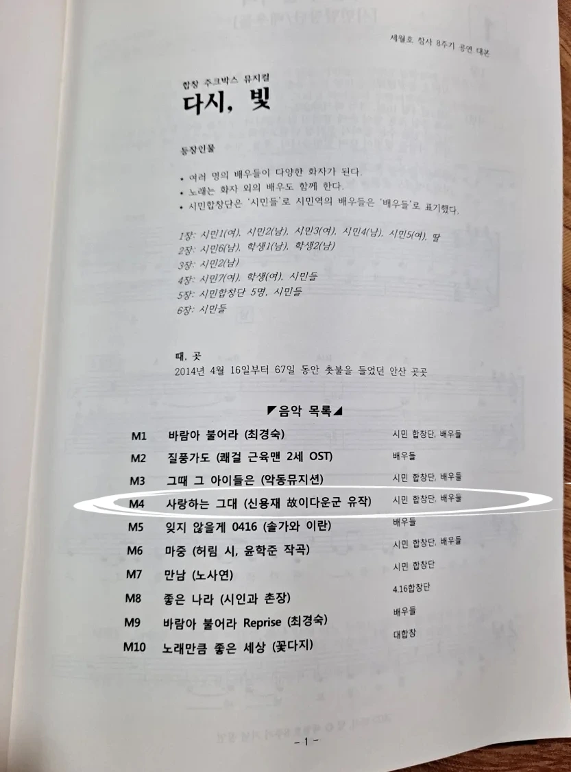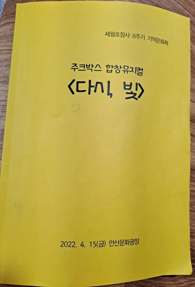 주크박스 합창뮤지컬 '다시, 빛'은 합창 10곡과 배우들의 대사와 노래가 6장으로 어우러진 뮤지컬이었어. 시민합창단과 뮤지컬 배우들이 무대 전면에 서고, 무대 양쪽 계단엔 일반 시민합창단이 가득 채워 섰단다. 416합창단과 평화나무합창단, 그리고 미리 신청하고 연습해서 함께한 300여 명의 시민합창단이었어. 노래는 <바람아 불어라>로 시작해서 <노래만큼 좋은 세상>으로 마쳤어. 함께한 시민들이 끝까지 꼼짝하지 않고 자리를 지켜주었단다.
