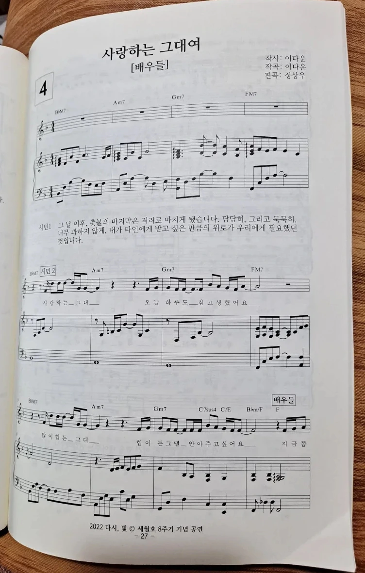 "일순간 맞닥뜨린 거대한 재난 앞에 어느 누구도 쉽게 말을 꺼내지 못했습니다. 위로의 노래조차 부를 수 없던 때에도 가슴속으로 간절히 외쳤던 한 마디."