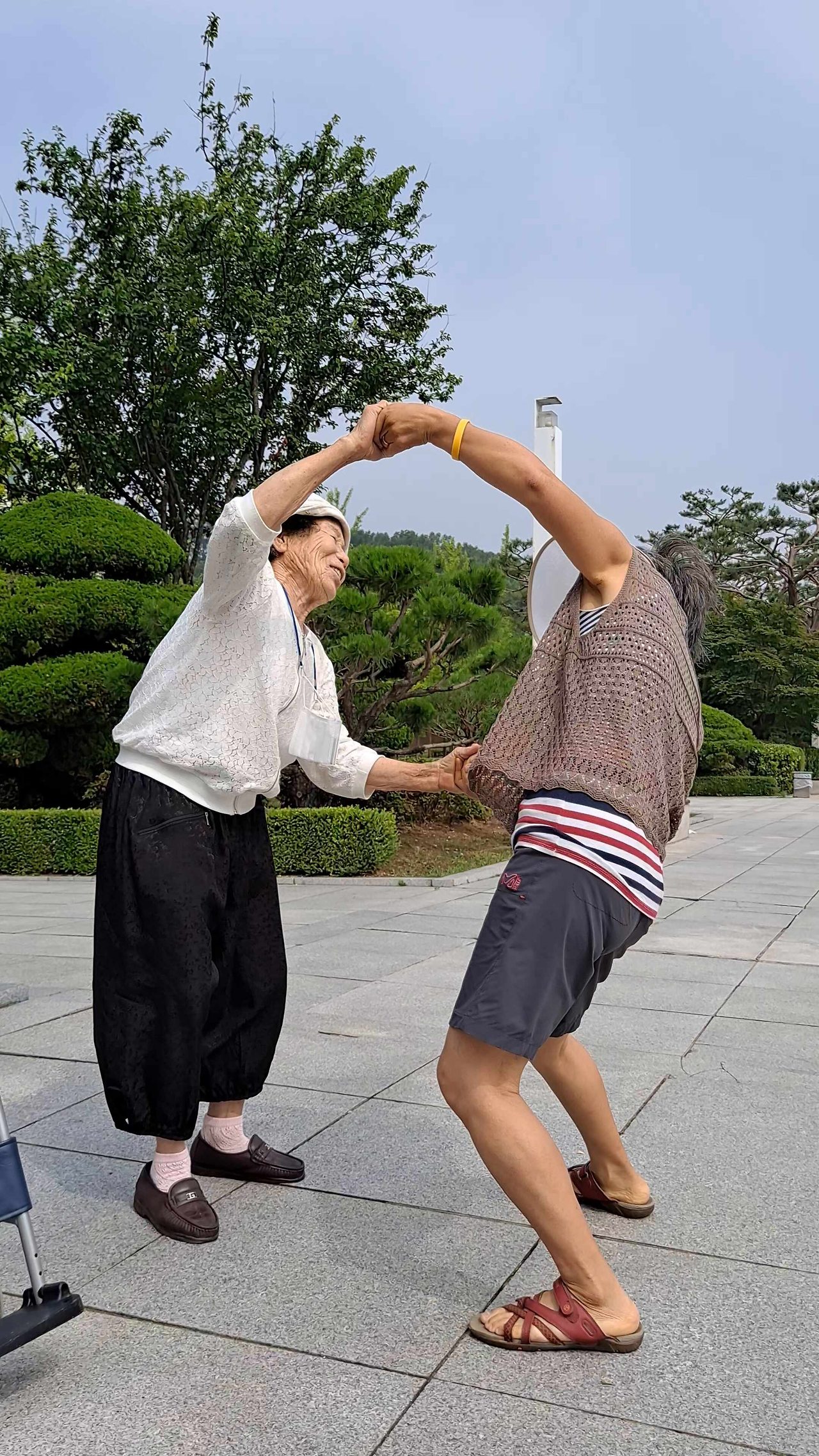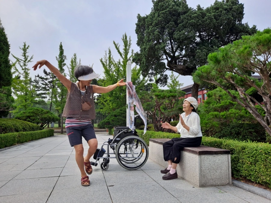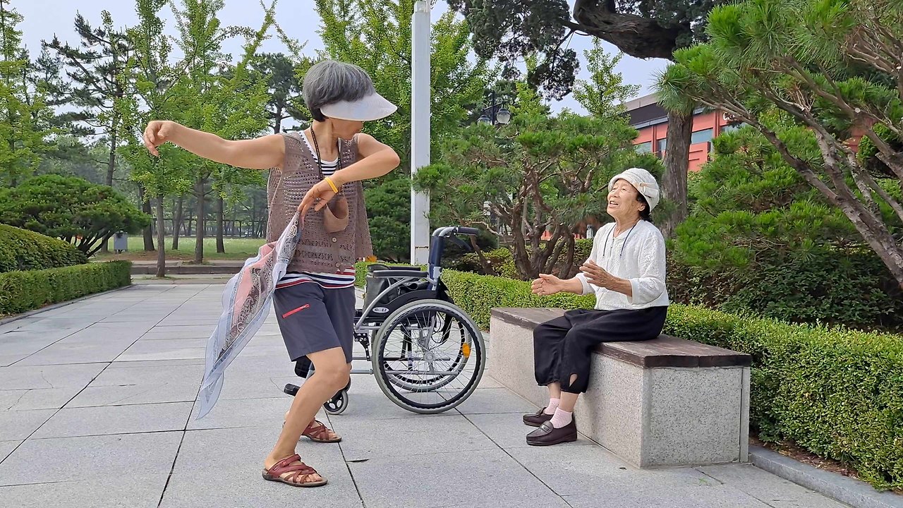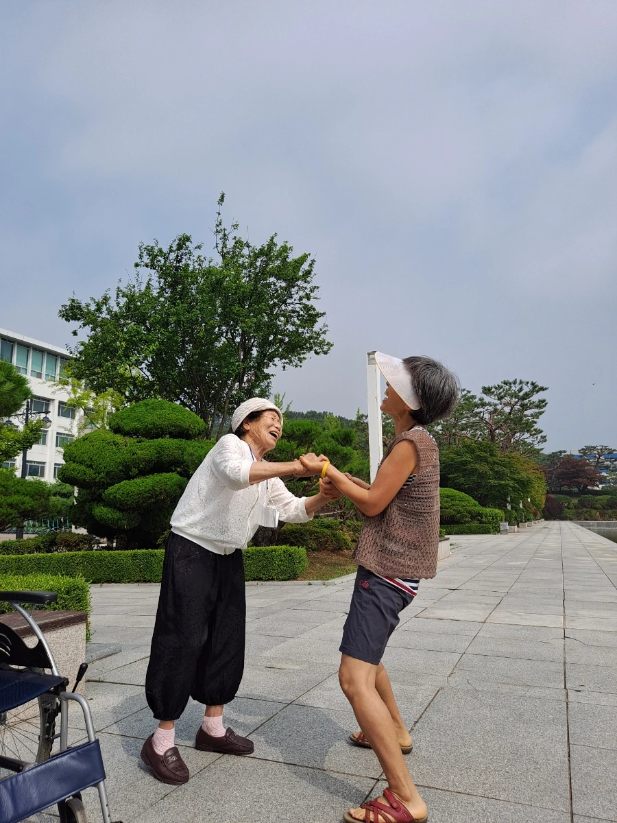 흥에 겨워 9순의 시어머니는 옛날 옛적 부르던 노래를 메들리로 쉬지 않고 불러낸다. 환갑 며느리는 노랫말도 가락도 다 알진 못하지만 즐기지 못할 이유는 없다. 등에 메고 있던 가방도 벗어젖히고 가방에서 스카프 하나 꺼내 본격 춤사위를 만든다. 흔들고 흐느적대고 휘돌리고 팔다리를 들고 돌고....신명 나면 춤 아니겄어? 얼씨구~~ 좋다~~ 이게 자연치유 아니겄어?