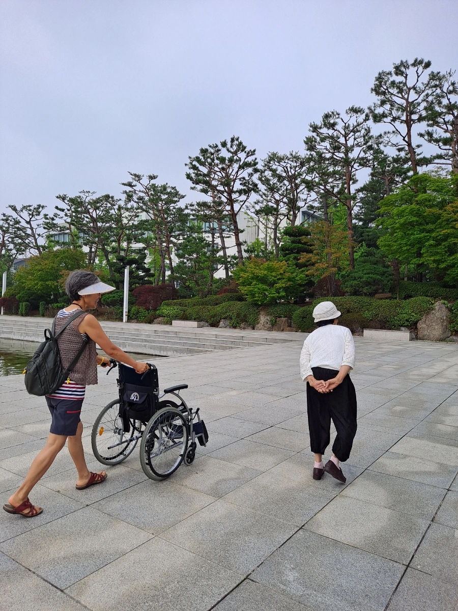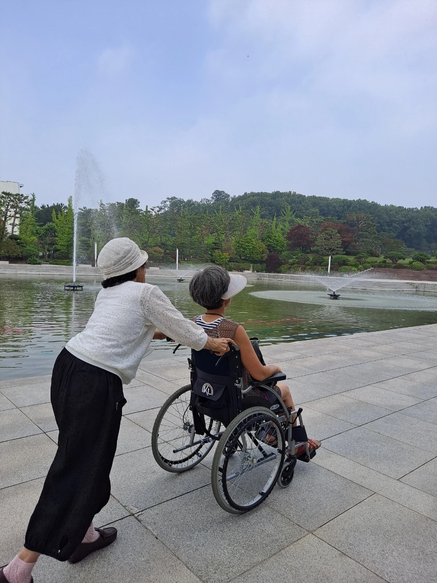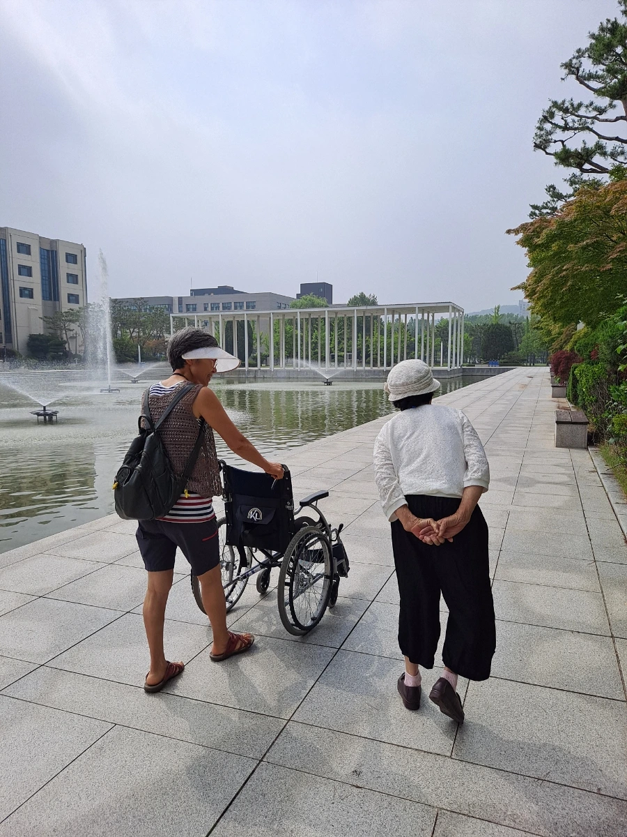 이제 분수 호수 3면을 돌고 마지막 둘레를 돌고 있다. 걷다 보니 노모의 다리에도 허리에도 힘이 오르는 게 느껴진다. 그렇다고 힘이 들지 않은 건 아니다. 굽고 휜 허리는 직립으로 오래 버티기 어려운 게 특징이다. 이제 어머니는 며느리를 휠체어에 태우고 밀며 걷기로 한다. 빈 휠체어는 너무 가볍게 밀려서 위험하니까. 노인들이 왜 유아차 같은 밀차를 밀고 다니겠는가. 굽은 허리 덜 힘들고 오래 걸을 수 있는 버팀목이 되기 때문이다.