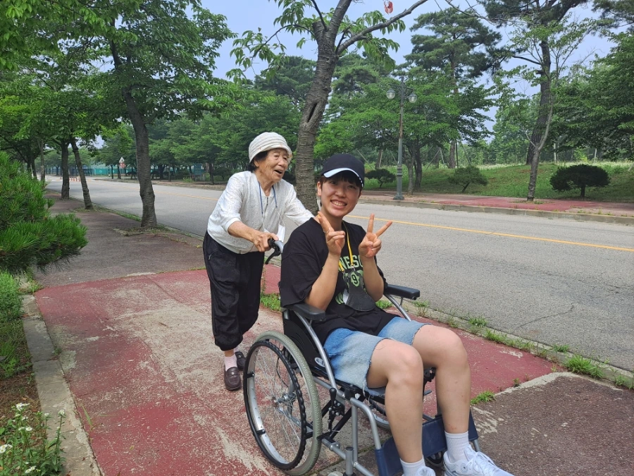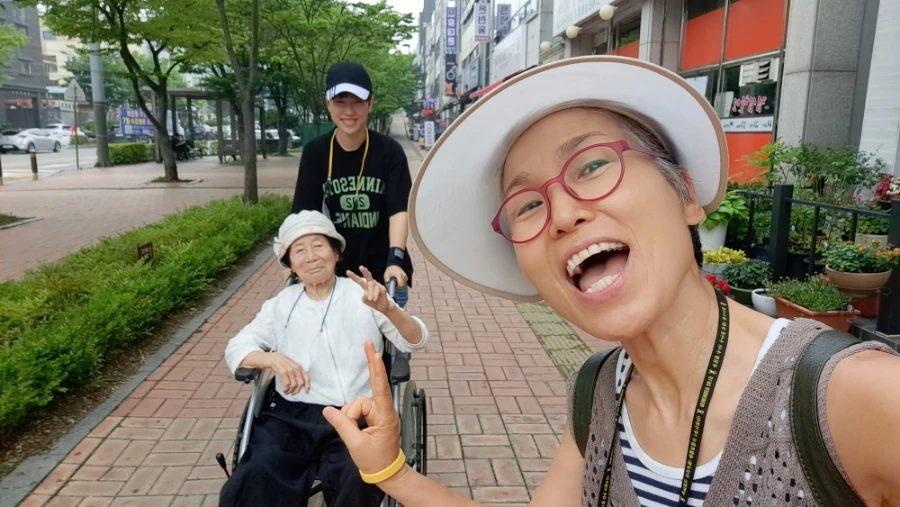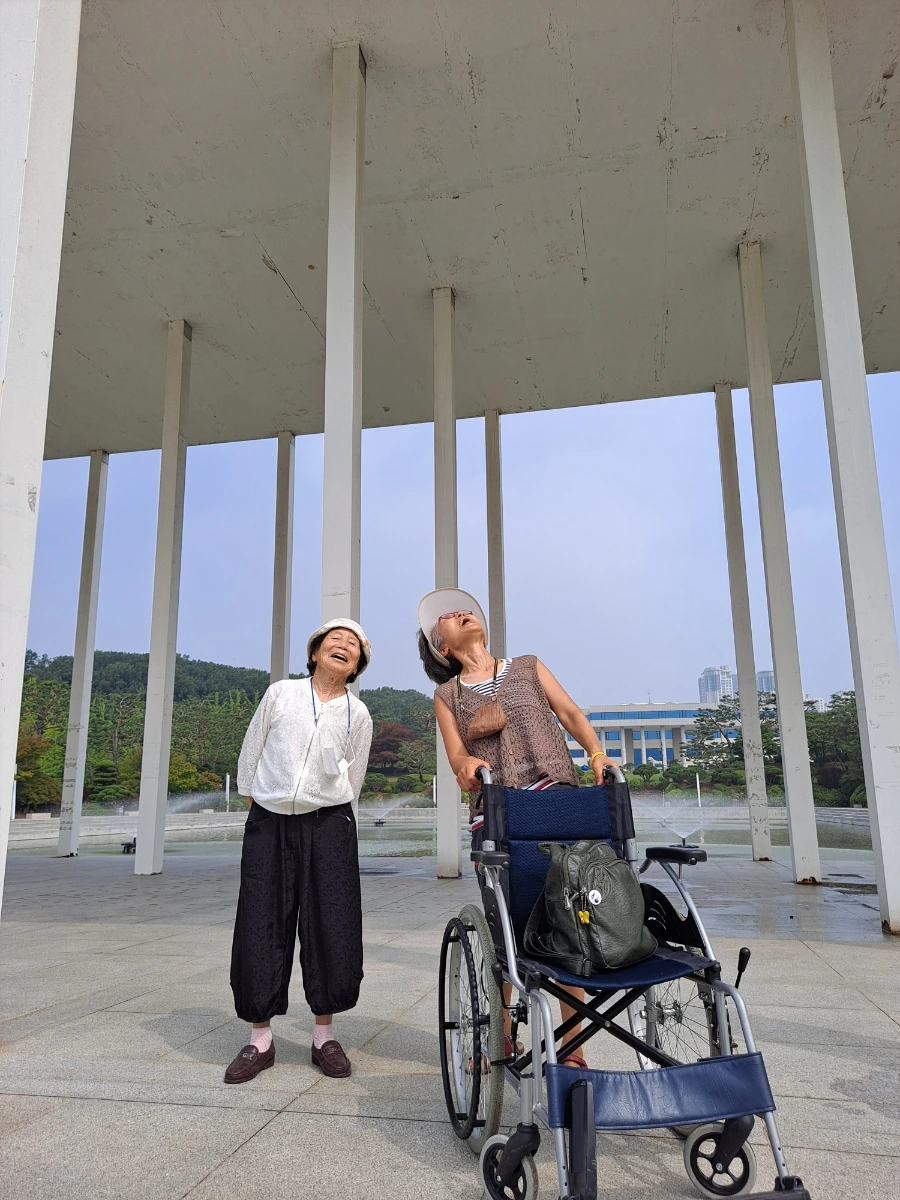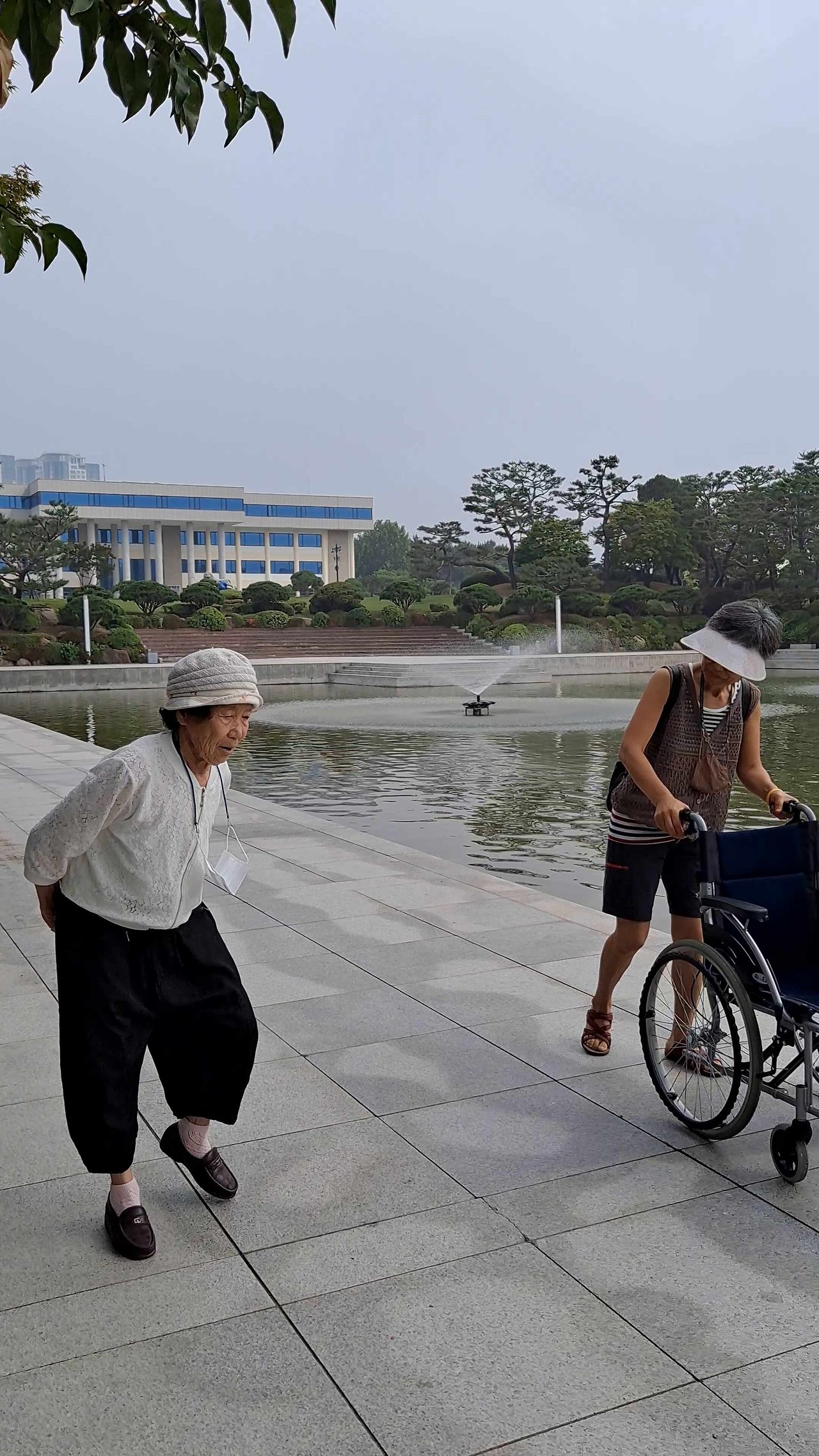 이제 분수 호수 3면을 돌고 마지막 둘레를 돌고 있다. 걷다 보니 노모의 다리에도 허리에도 힘이 오르는 게 느껴진다. 그렇다고 힘이 들지 않은 건 아니다. 굽고 휜 허리는 직립으로 오래 버티기 어려운 게 특징이다. 이제 어머니는 며느리를 휠체어에 태우고 밀며 걷기로 한다. 빈 휠체어는 너무 가볍게 밀려서 위험하니까. 노인들이 왜 유아차 같은 밀차를 밀고 다니겠는가. 굽은 허리 덜 힘들고 오래 걸을 수 있는 버팀목이 되기 때문이다.