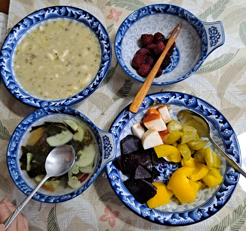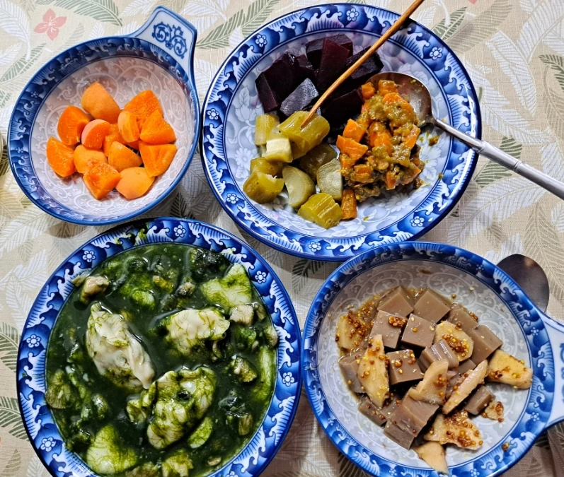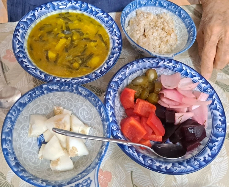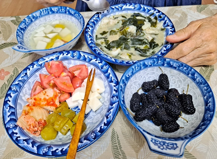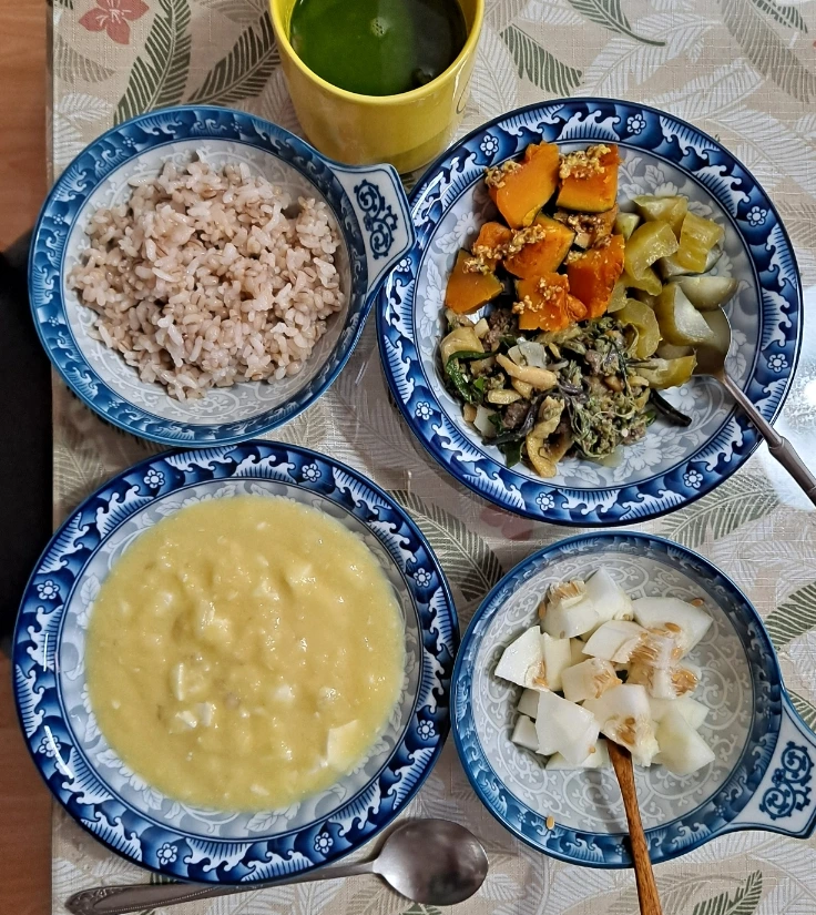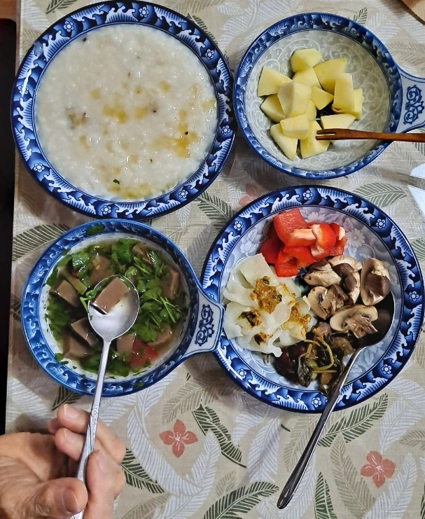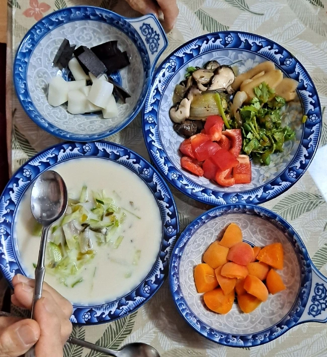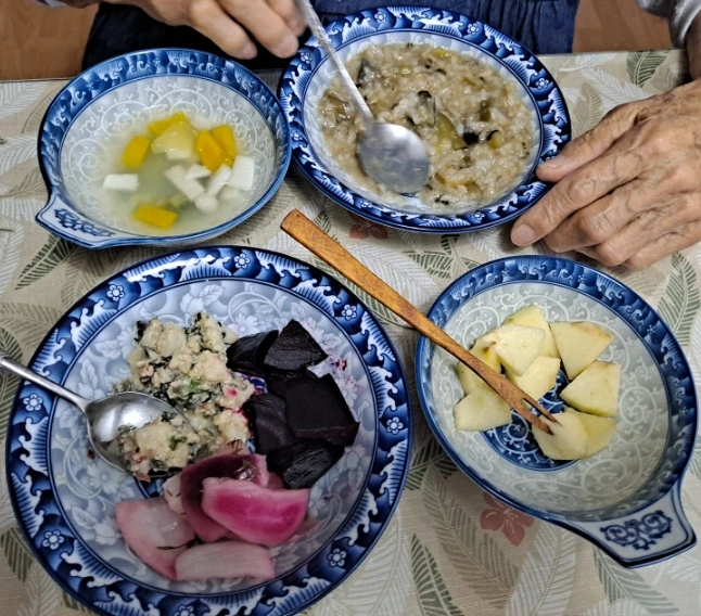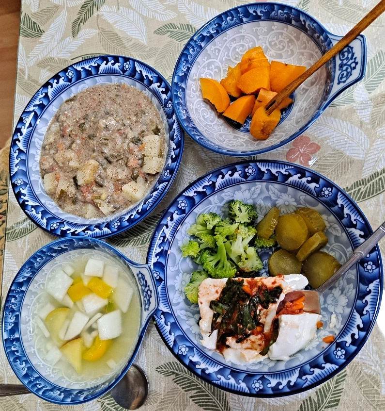 뇌졸중 노인을 위한 한 달 가정간호 자연치유 식단 조금만 맛보자. 피를 맑게 하고 소화 흡수 쉬운 조리로, 지방과 동물성 식품은 피하고 채식 자연식으로 했다. 어쩌다 한번 살코기 다진 것 조금만. 생식과 화식 적절히, 다양한 죽과 무른 밥 적절히, 씹기 좋게 조각내고, 젓가락질 어려우니 작은 숟가락과 포크 사용. 옆에서 다른 숟가락으로 수발했다. 틀니라 입맛 없어하던 분인데 실화냐? 매끼 접시들은 깨끗이 싹싹 비워졌다.