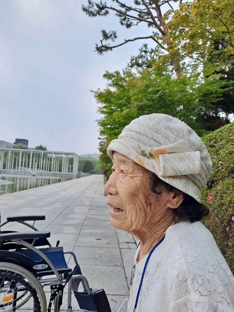오늘의 운동 목표는 걸어서 분수 공원 한 바퀴 완주하기. 원래도 척추협착으로 허리가 굽고 휜 9순의 노모는 뇌졸중으로 오른쪽 팔다리를 힘쓸 수 없는 상태로 우리 집에 왔다. 집안에 휠체어에 보행보조기에 변기의자에 기저귀까지, 삶의 풍경이 달라진 한 달이었다. 부축 없이 나날이 걷는 양이 늘었다. 몸은 왼쪽으로 기울었는데 걸음은 오른쪽으로 게처럼 기울어가는 어머니. (아~~ 너무 오른쪽으로 기울어진 이 세상이니 좌편향 좀 하셔도 괜찮다니깐!) 휠체어를 밀고 따라가며 노모를 관찰하며 빙긋 남모르는 미소를 짓는 며느리다.