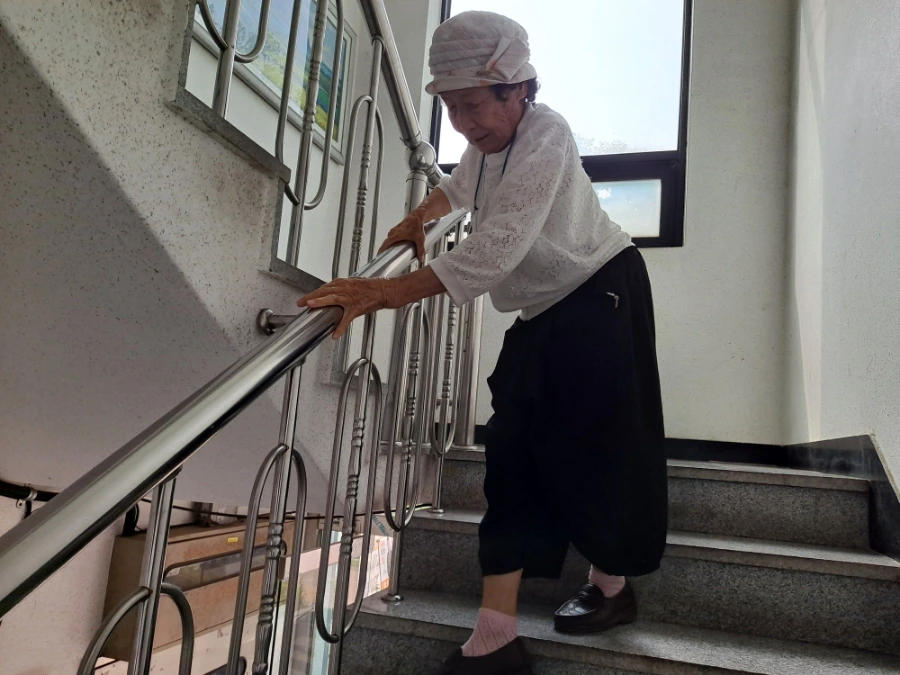 허리가 굽으니 고개를 빳빳이 들 일 없는 노모다. 하늘을 올려다 보긴 더 어렵다. 잠시 하늘 위 해를 보자고 걸음을 멈춰 선 며느리. 허리 펴시고 자~~ 엄마! 저 위에 하늘 한 번 보고 가자. 해가 비치는 게 보이지? 똑 바로 허리 펴고, 해 쪽으로 한 번 봐. 그렇지 그렇지 더 더~~~ 고개 들고 쳐다보고~~~ 노모의 고개는 최대한 뒤로 젖힌 게 저 정도다. (참고로 이 며느리는 시어머니를 엄마라 부르고 서로 평어를 쓴다. 시엄마도 아주 좋아한다.)