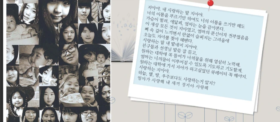 나는 정말 울고 싶을 때 항상 옆에 네가 있었는데! 너 혼자 고민 말고!! 그래도 우리 1년은 잘 버텼잖아! 나, 4월에 야자 신청했다! 넌 더 당당하게 넌~~ 미스터 미스터 GGG 우리 우정 평생 가자. 사랑하는 거 알G? 우리 졸업만 하면 당당하게 hope집으로 go! 그동안만 꿈을 향해 달리자!!! From 문지성(세월호 참사 희생자) -60쪽