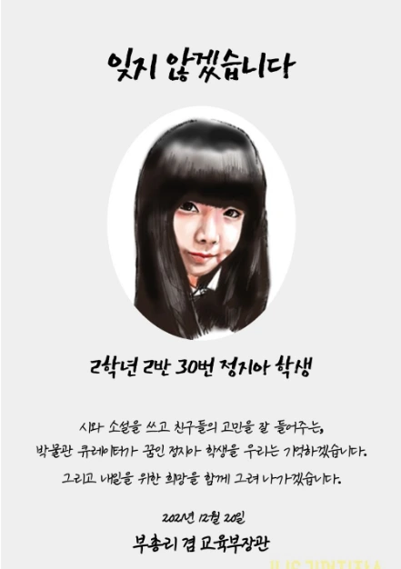 그 모든 꿈 좋은 곳에서 꼭 이루렴... 너를 보내기 싫고 놓아주기 싫지만, 좋은 곳 편안한 곳에서 친구들과 행복하기를 매일 기도할게, 지아야. 다음 세상에서도 꼭 엄마 딸로 태어나줘. 엄마가 다 못한 지아의 사랑 꼭 보답할게. 이 세상에서 엄마라는 이름으로 살게 해줘서 정말 고마웠고, 정말 사랑해, 지아야. 엄마가 또 편지 그럼.... 지영희 엄마가 정지아 딸에게.... <한겨레신문> 2014년 7월 20일 자 - 81쪽