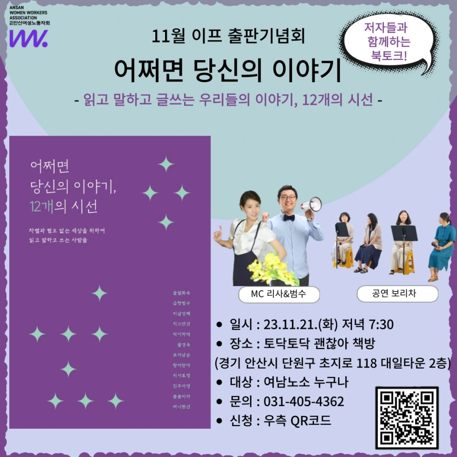 올가을은 여러 모로 내게 특별한 계절이었다. 같이 읽고 말하고 쓰는 벗들과 보라색 책 『어쩌면 당신의 이야기, 12개의 시선』을 독립출판으로 묶어 냈다. 내가 글쓰기 모임을 진행했다고? 그것도 12명이 5개월간 함께하는 프로젝트로? 결과물로 책까지 냈다고? 그렇다. 믿기지 않을 정도로 성취감이 큰 프로젝트였다. 이건 7년간 함께 읽고 토론해 온 이프가 있어서 가능한 일이었다. 그게 다가 아니다. 출간기념회 북토크를 기획하고 준비하고 있다.