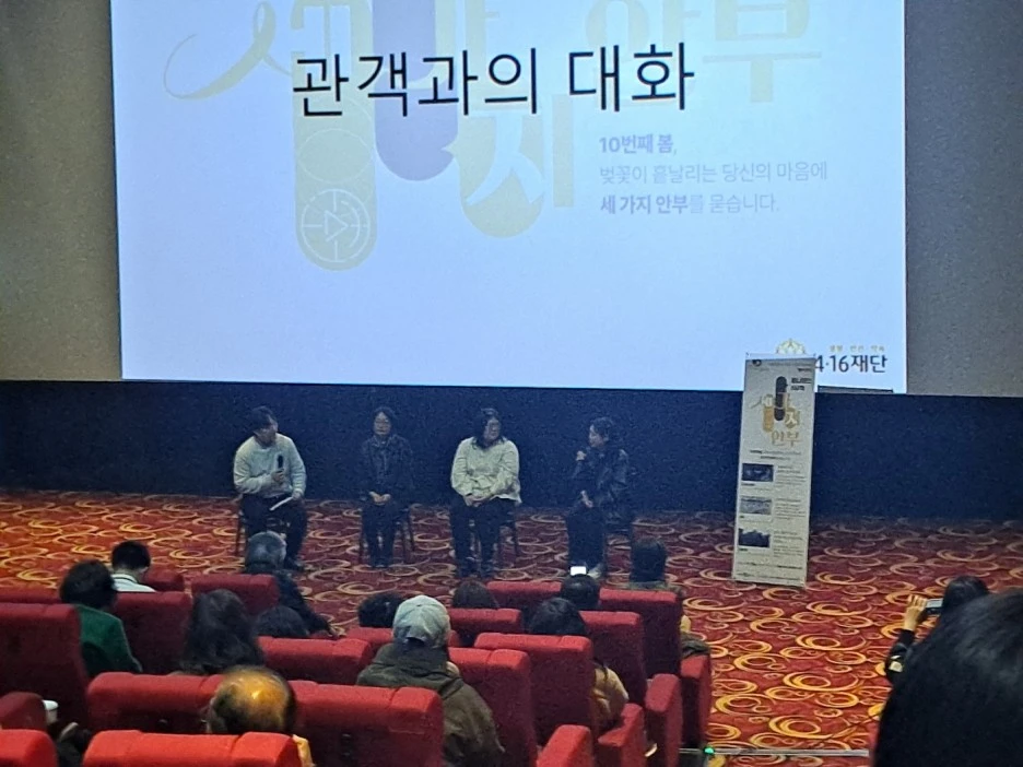 민지야, 아빠 마음 알지? 엊저녁에도 안산에서 나는 이런 목소리를 들었단다. 어디서? <세 가지 안부>라는 옴니버스 3부작 영화 시사회에서였어. "10번째 봄 벚꽃이 흩날리는 당신의 마음에 세 가지 안부를 묻습니다"라는 의미를 가진, 세월호 10주기 영화상영회였어. <그레이 존>, <흔적>, 그리고 <드라이브 97> 세 편의 영화가 각각 언론인들, 유가족 부모님들, 그리고 생존자 친구들의 고백이자 안부인사더구나.