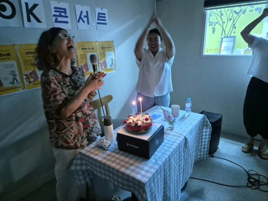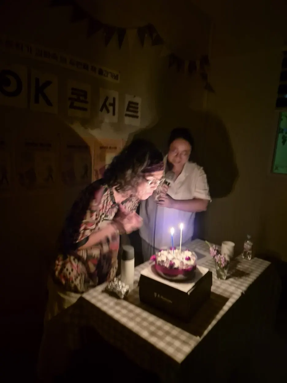 출간 축하 케이크를 사들고 온 벗은 희야였다. 20대 청춘을 같은 단체에서 보낸 후배이자 친구다. 몇 년 전 희야가 내게 전화를 걸어와서 보고 싶다고 한 게 재회의 시작이었다. 30년 만이었다. 친구는 내 책을 읽으며 자기 삶을 다시 보고 새로운 후반전을 준비 중이다. 나는 전생에 나라를 몇 개나 구했길래 이런 벗이 있단 말인가. 두 개의 촛불 말곤 모든 불을 끄고 다 함께 출간 축하 노래를 불렀다. 한마음으로 기뻐해 주는 벗들 있음이 얼마나 큰 복인지 나는 안다. 어둠 속에 홀로 빛나는 촛불, 그리고 울려퍼지는 목소리 목소리들. 내 말과 글이 그러하기를, 용기의 목소리요 희망의 작은 촛불 되길 기도하며 촛불을 껐다.