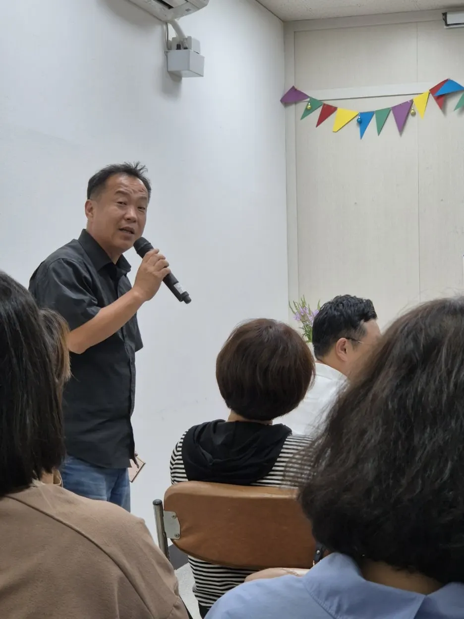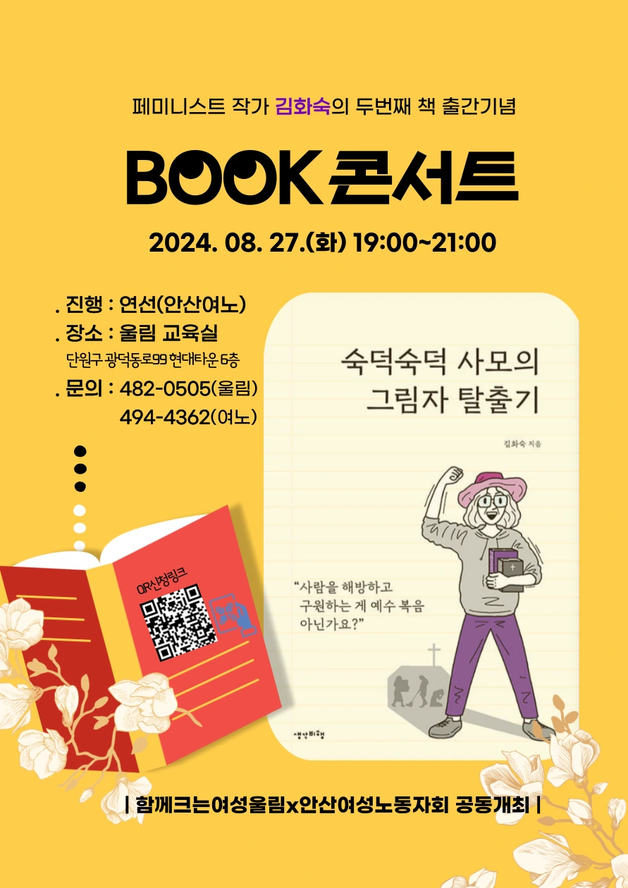 웹자보 상단 검은색 글자들 속에 내 이름 석 자만 보라색으로 도드라져 보인다. 이 자보가 벌써 과거의 일이 되었다. '페미니스트 작가 김화숙의 두 번째 책 출간기념 북 콘서트'를 잘 마쳤다. 《숙덕숙덕 사모의 그림자 탈출기》가 세상에 나온 지 딱 두 달이 찬 어제, 2024년 8월 27일(화) 저녁 7시였다. 내가 회원 활동하는 두 여성 단체 안산여성노동자회와 함께크는여성 울림이 공동기획한 행사였다. 접근성이 더 좋고 공간이 조금 더 넓은 울림 교육장에서였다. 감사와 기쁨으로, 사진으로나마 어제의 북 콘서트 풍경을 짧게 기록한다.