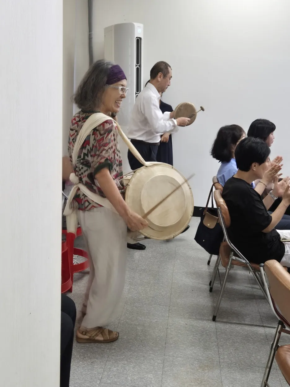 안산 일동의 노래하는 사람들 '보리차'가 '나무의 꿈'을 부르며 북 콘서트 문을 열었다. 가사도 네 사람의 목소리도 마음을 부드럽게 해주기에 모자람이 없었다. 순전히 김화숙 작가에 대한 연대와 응원으로 와준 귀한 노래벗들. 교육실 밖에서 장구를 메고 대기했지만 내 귀는 온통 노래로 향해 있었다. 풍물샘 최문성이 꽹과리로 이끄는대로 내가 장구를 치며 함께 들어갔다. 휘모리-자진모리-굿거리-자진모리-휘모리 장단으로 한바탕 놀았다. 이어서 '범띠 가시내'를 꽹과리와 장구 장단에 맞춰 다 함께 불렀다. 이건 순전히 보리차가 제안해 준 덕분이었다. 책에 나온 범띠가시내를 지나쳐버리지 않고 화숙이랑 같이 앵콜로 부르자, 그 뜻대로 부랴부랴 장장단연습해서 다함께 노래할 수 있었다.
