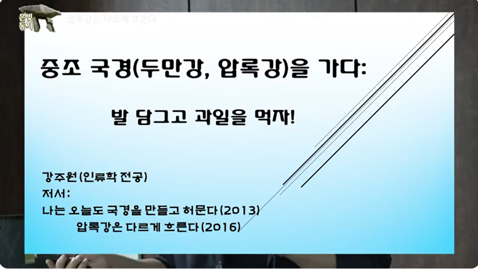 7박 8일 정도 200만 원짜리 답사 여행을 짧게 요약한다. 이명박근혜 정부 때 애국주의 반공교육 공간으로 압록강 두만강으로 한국사람들 많이 갔다. 김을동 의원은 "강 중앙을 몰래 넘어봤다"라는 말을 버젓이 했다. 국경은 압록강 두만강 한가운데 그어진 게 아니다. 국경은 강을 공유한다. 철조망도 있지만 없는 데가 더 많다. 철조망은 반농반진으로 소가 강에 들어가지 못하게 설치했다는 말이 있을 정도다.